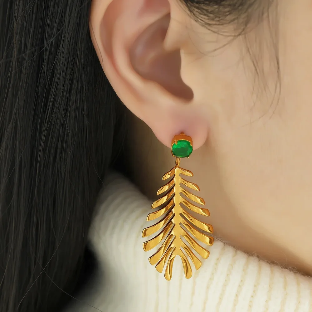 Hot New Unique Stainless Steel Inlaid Zircon Earrings Exaggerated Gold Plated Feather Drop Earrings for Women