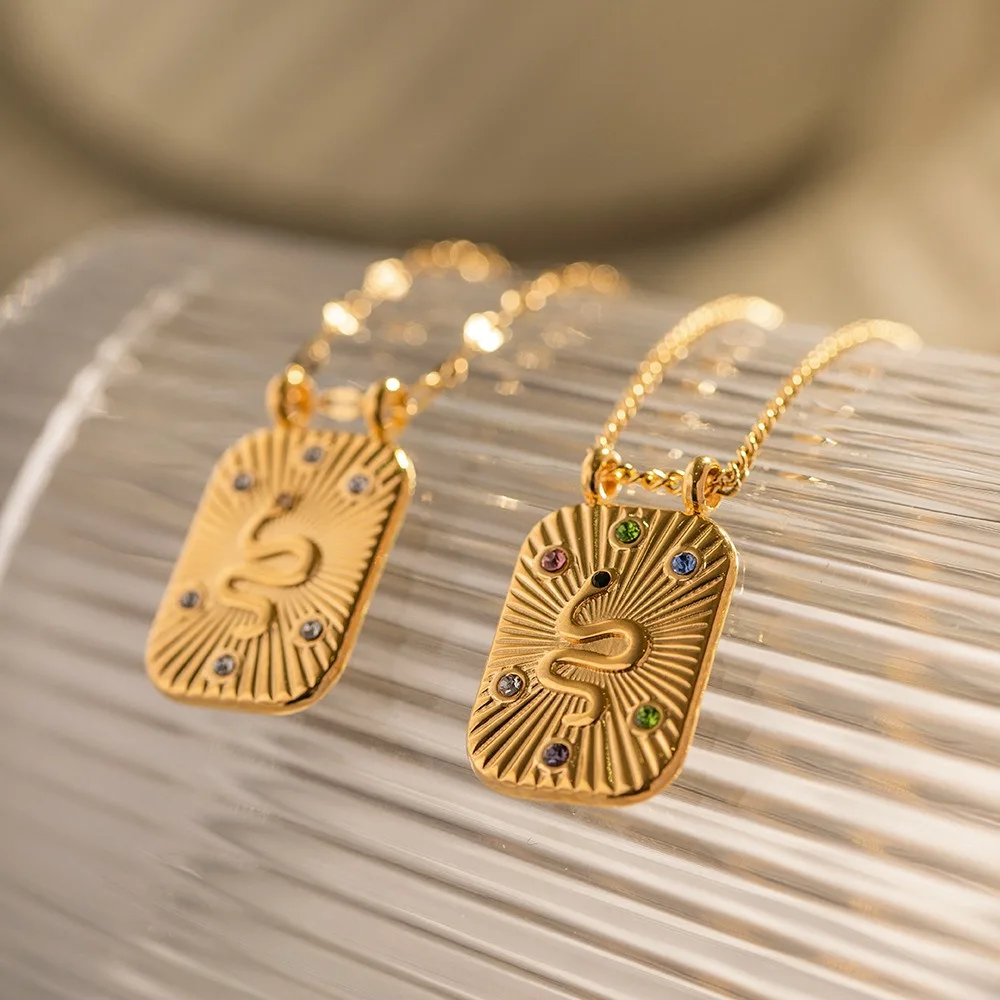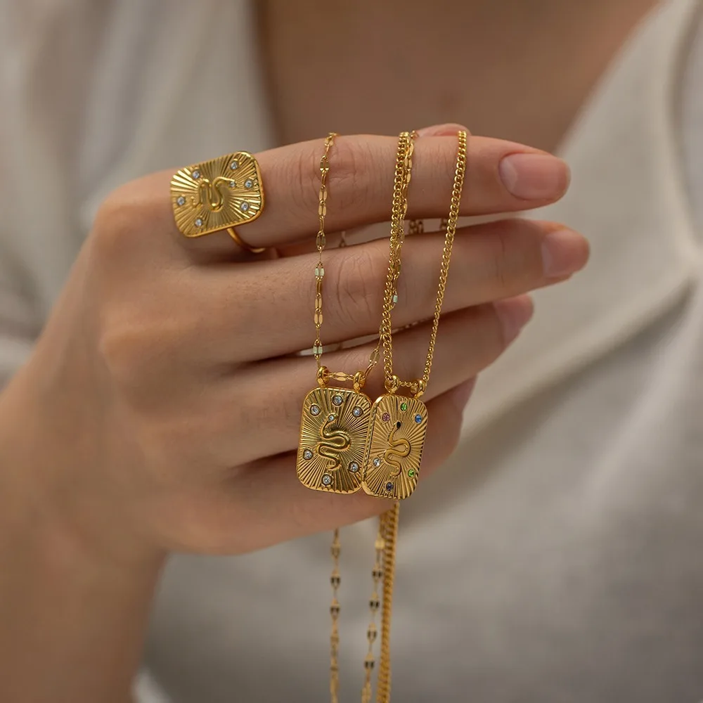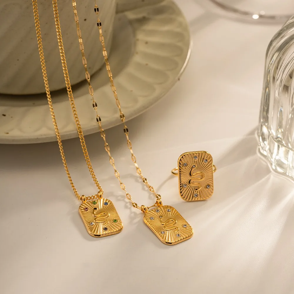 Hot Sales 18K Gold Plated Stainless Steel Inlaid Colorful Zircon Square Shape Snake Necklace Ring Jewelry Set-for Gift