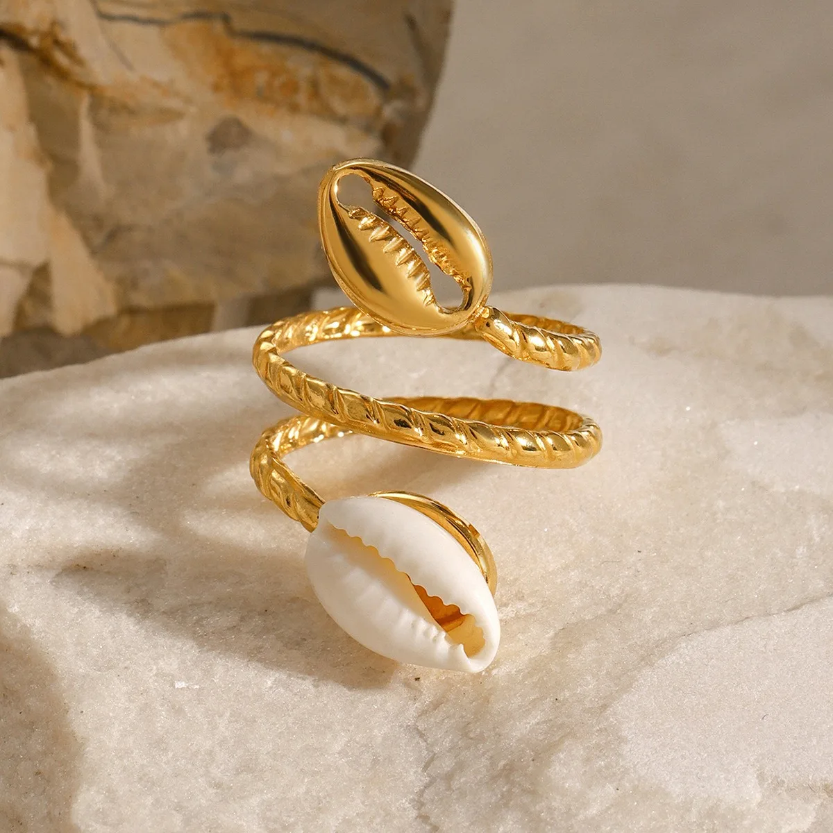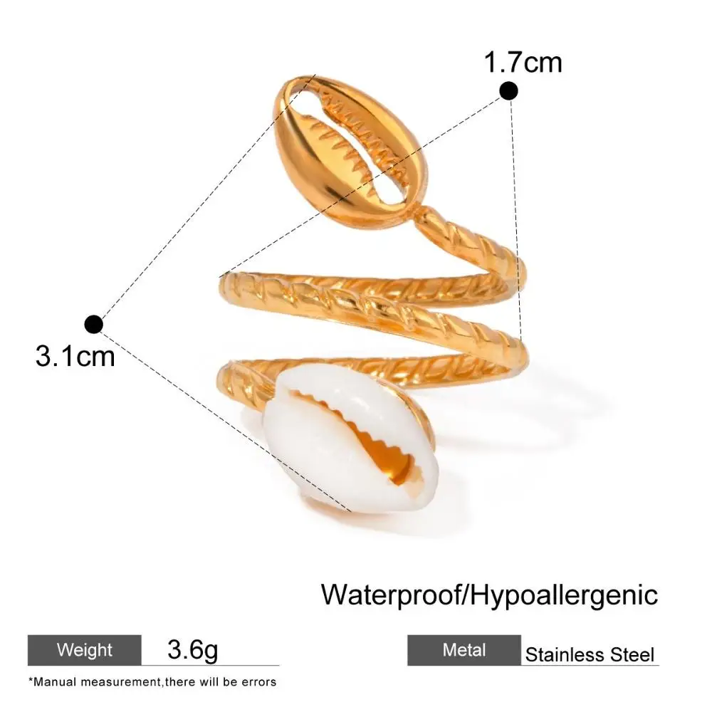 Custom 18K Gold Plated Women's Stainless Steel Jewelry Trendy Creative Geometric Open Shell Ring Waterproof Adjustable Ring
