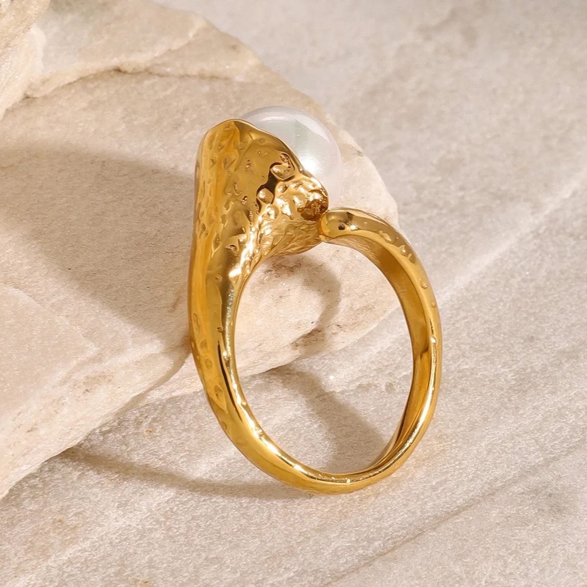 European American Luxury Trendy Open Ring 18K Gold Plated Stainless Steel with Hammer Pattern Inlaid Artificial Pearl