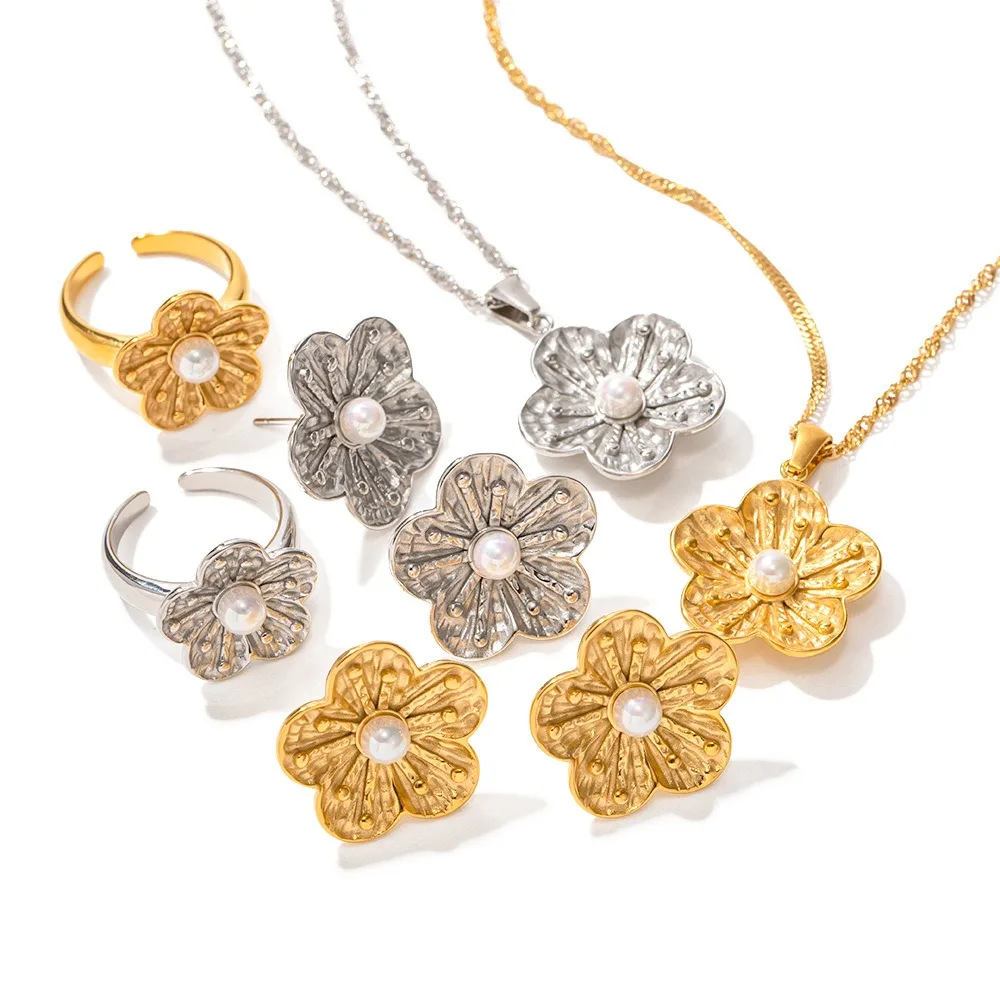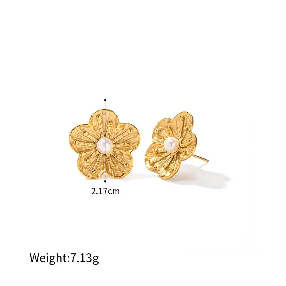 Vintage Style Gold Plated 316L Stainless Steel Flower Pearl Stud Earrings Hammering Pattern Trendy Women Jewelry