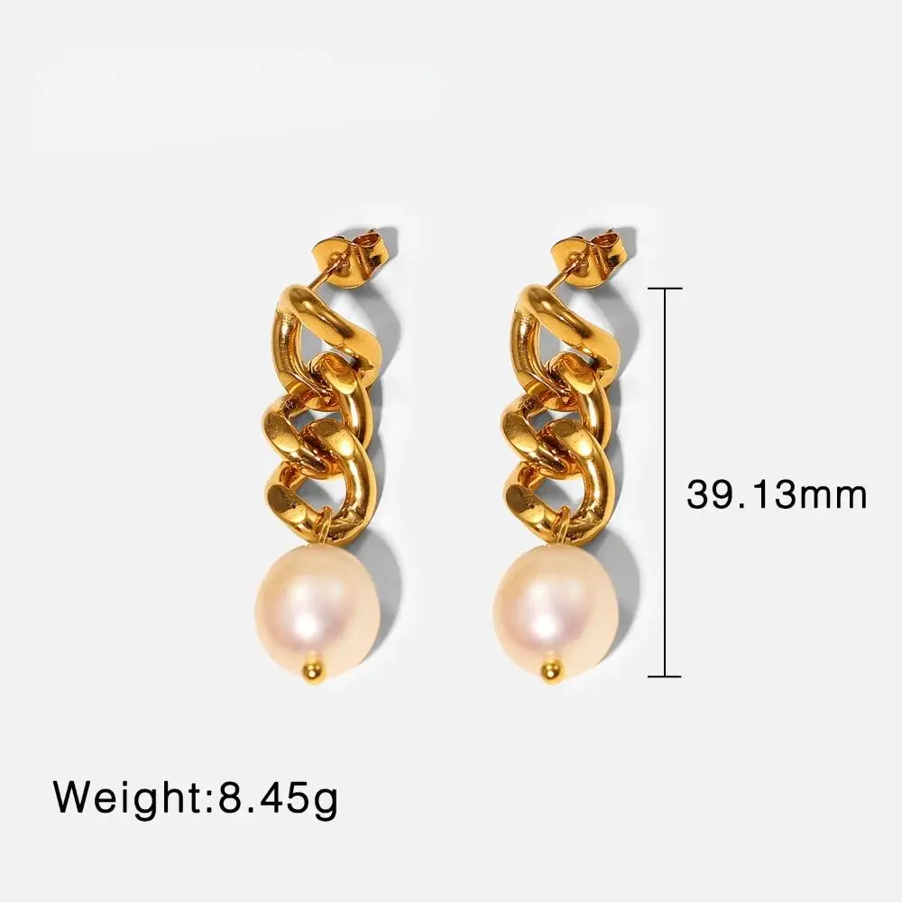 18K Gold Drop Stud Earrings for Women Fashionable Stainless Steel Chain Link with Fresh Water Pearl Charms Trendy Style