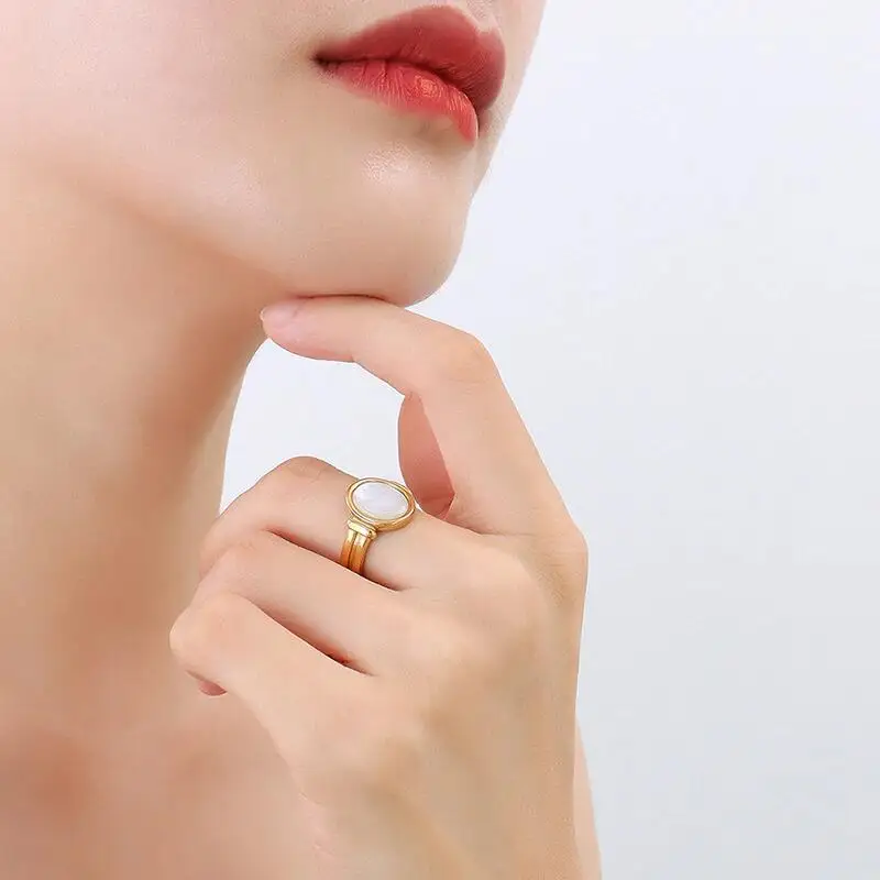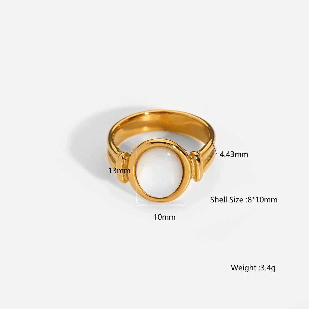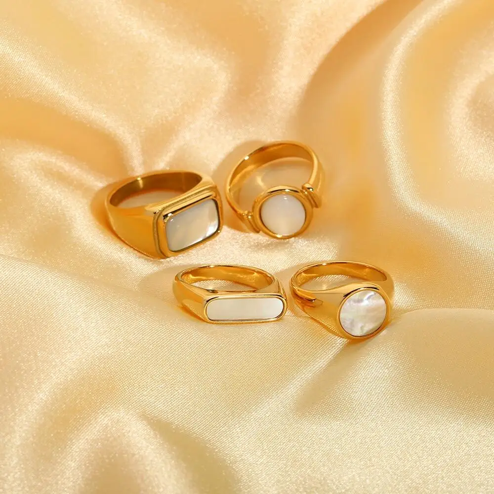 Fashionable Trendy 18k Gold Plated Waterproof Chunky Signet Ring Classic White Shell Statement Jewelry Made of Stainless Steel