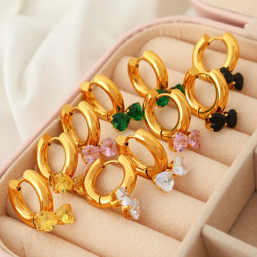 2026 New Arrival 18K PVD Gold Plated Heart Zircon Bow Drop Earrings for Women Stainless Steel Hypoallergenic Tarnish Free