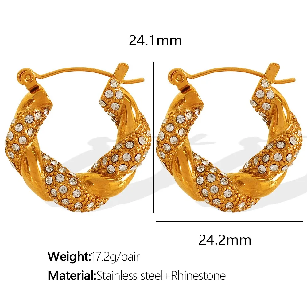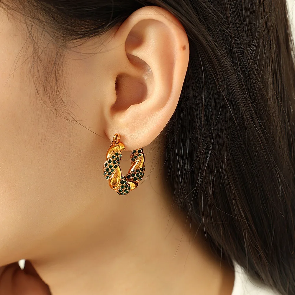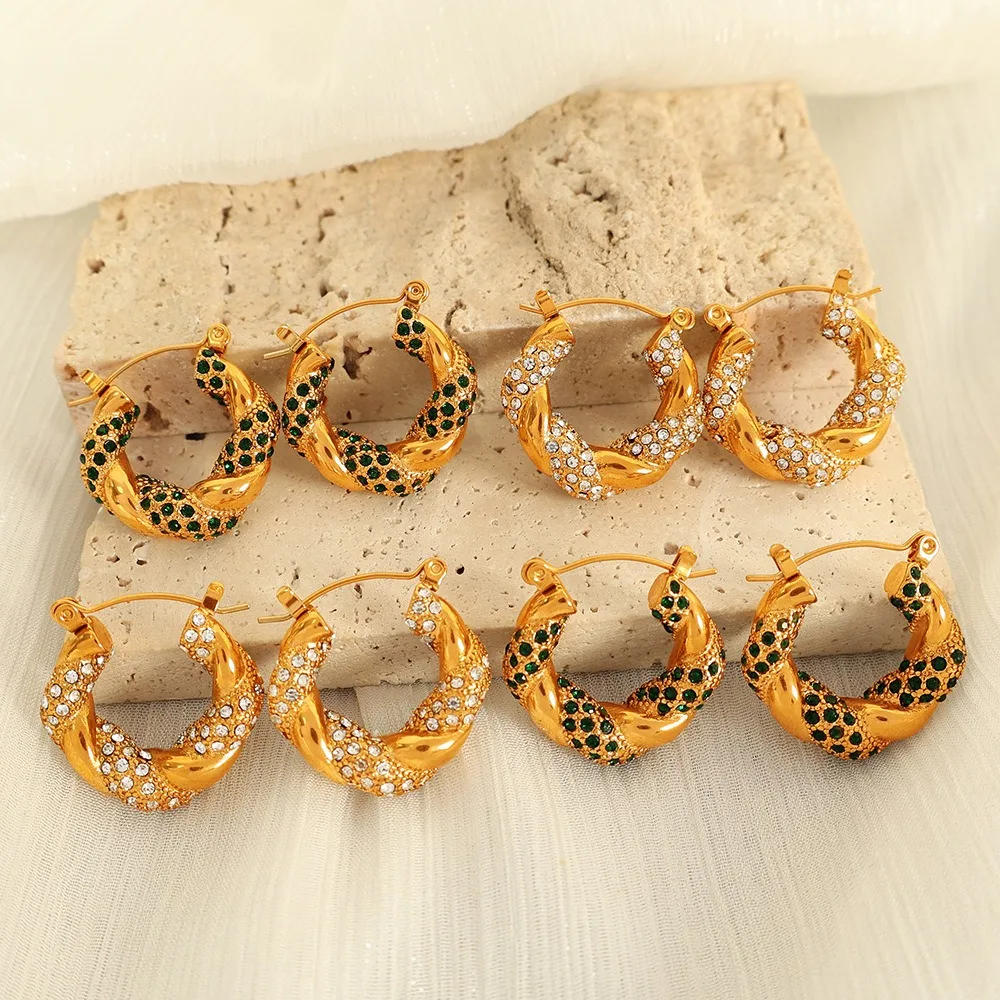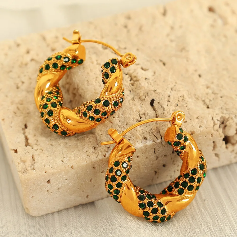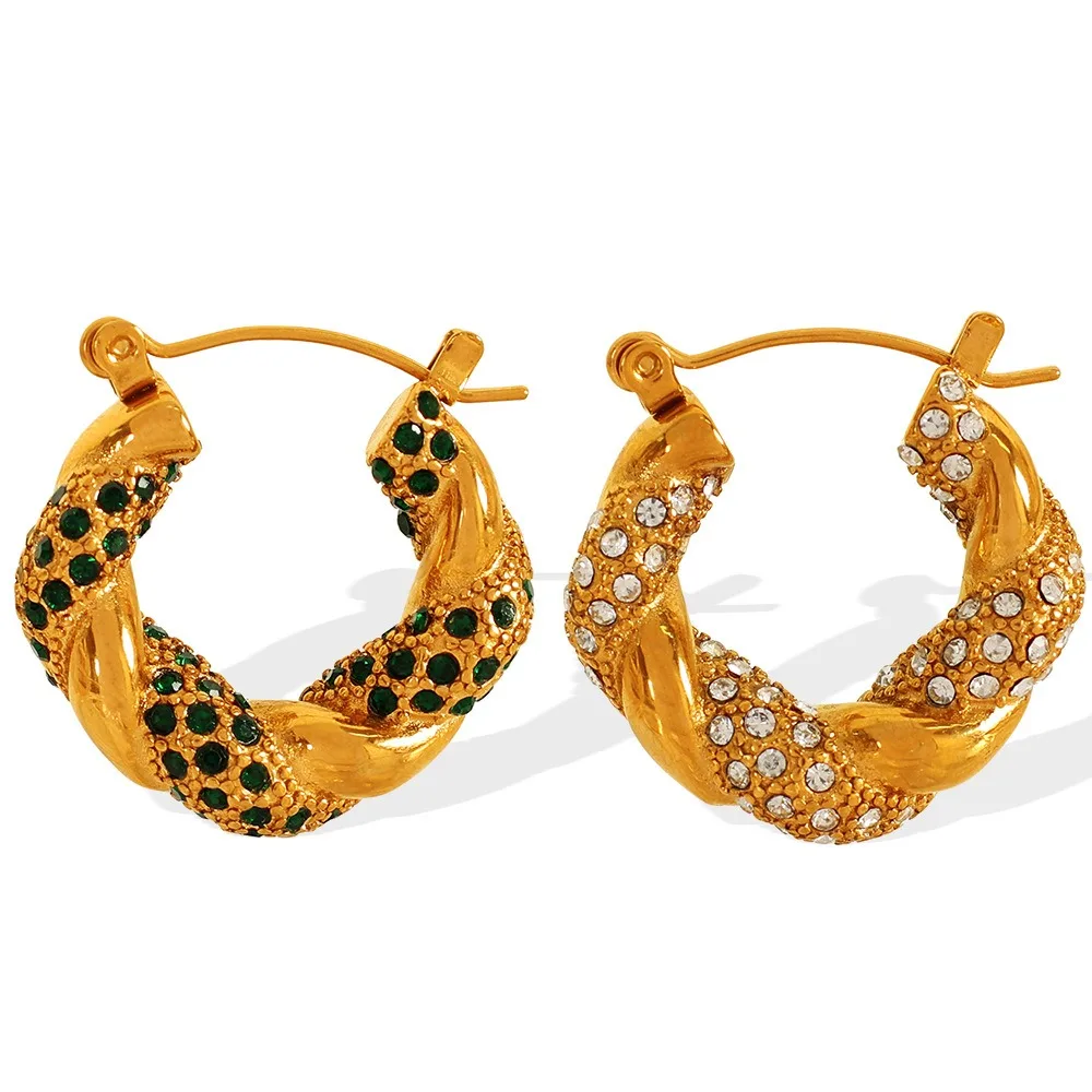 New Hot 18k Gold Plated White Green Rhinestone Earrings Tarnish-Free Trendy Small Twisted Stainless Steel Hoop Jewelry
