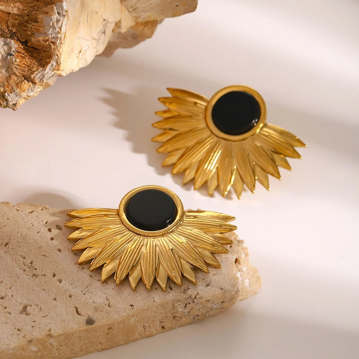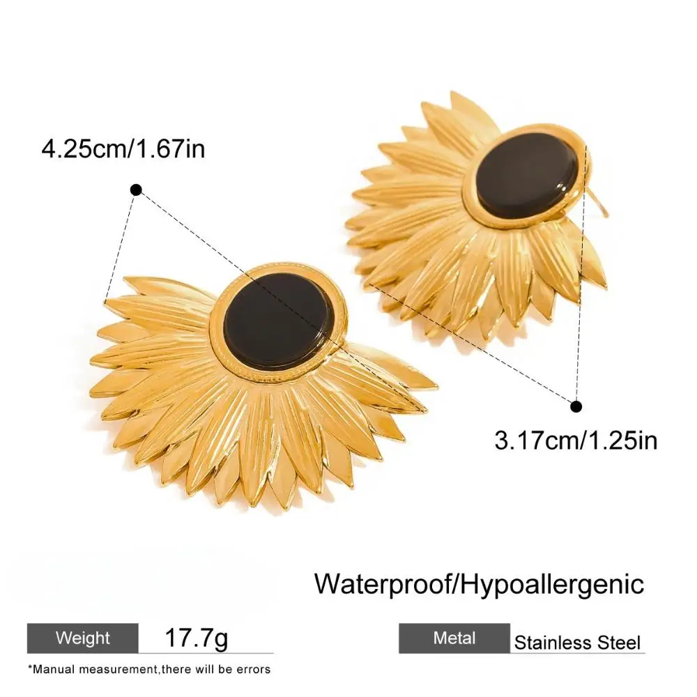 Women's New Creative 18K Gold Sunflower Earrings Trendy Stainless Steel Waterproof Black Agate Stud Jewelry Personality Style