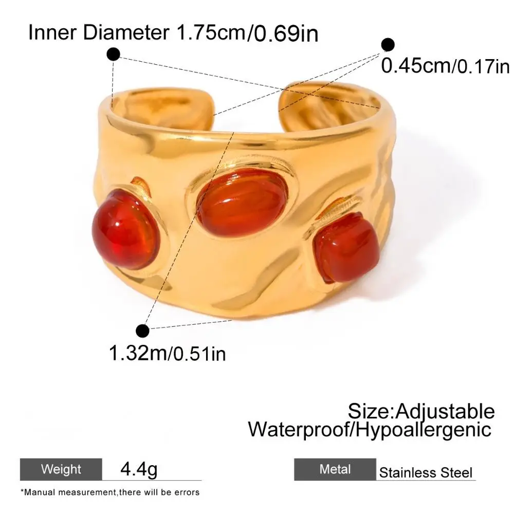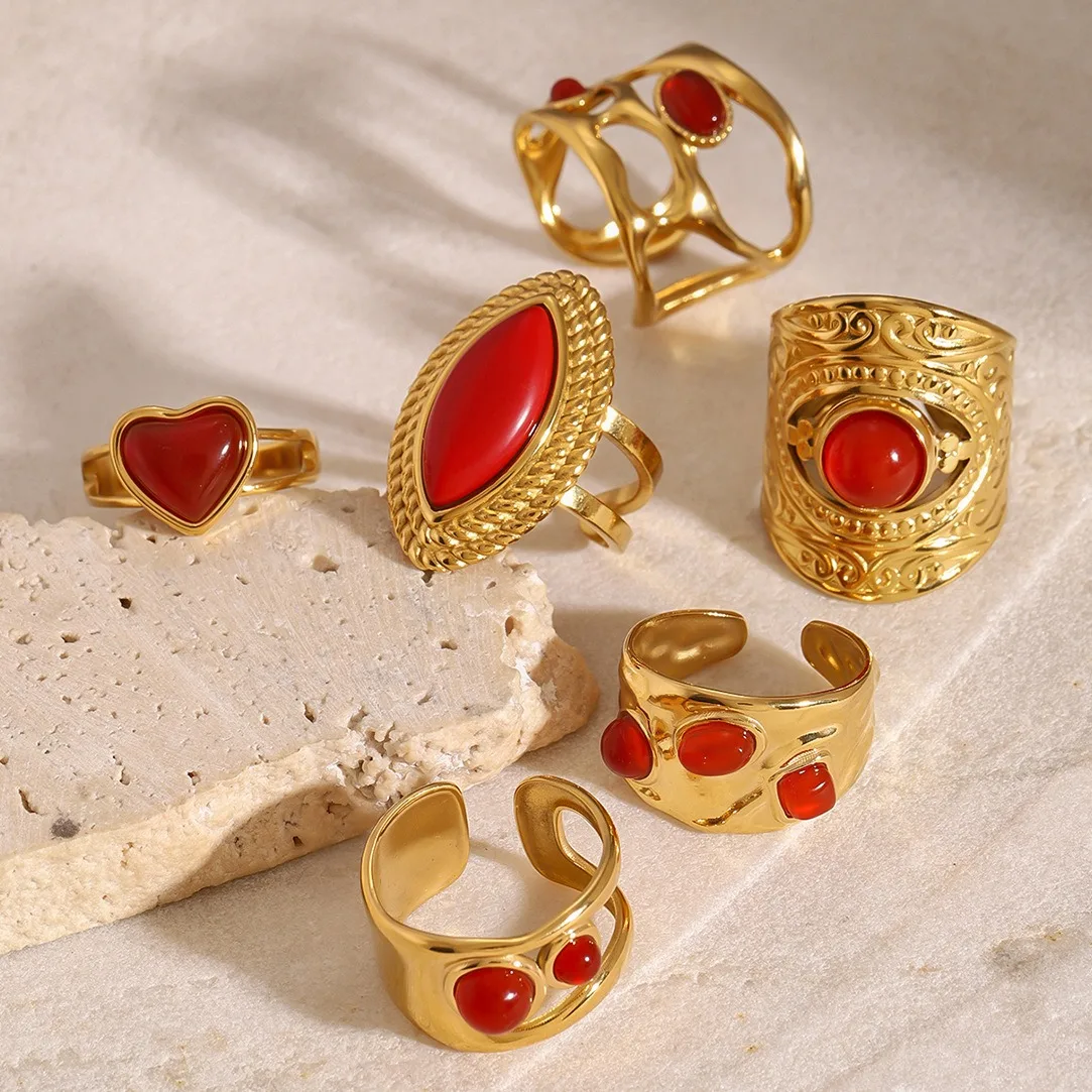 Light Luxury Vintage Style 18k Gold Stainless Steel Open Ring Trendy Natural Red Agate Ring for Men and Women