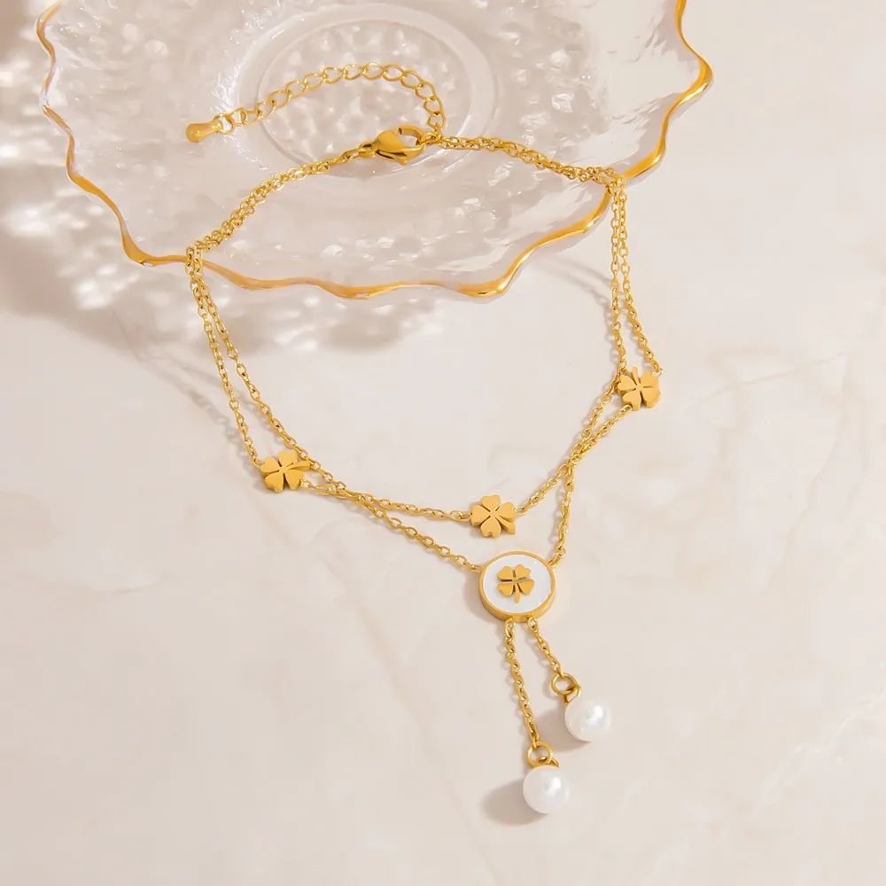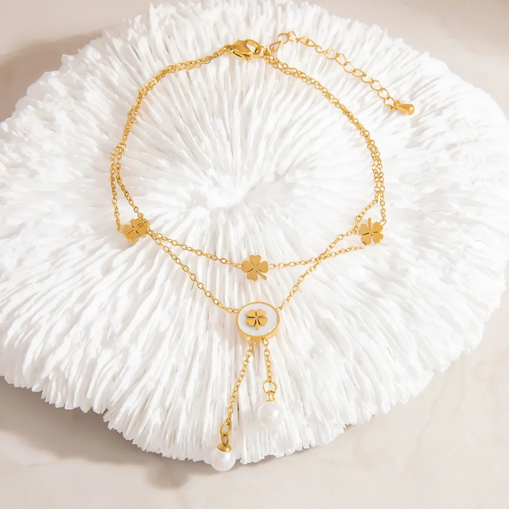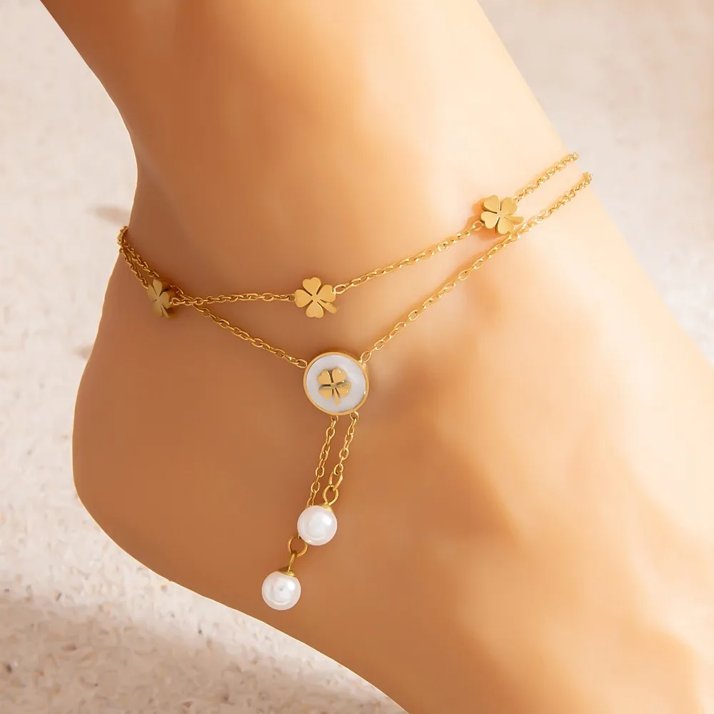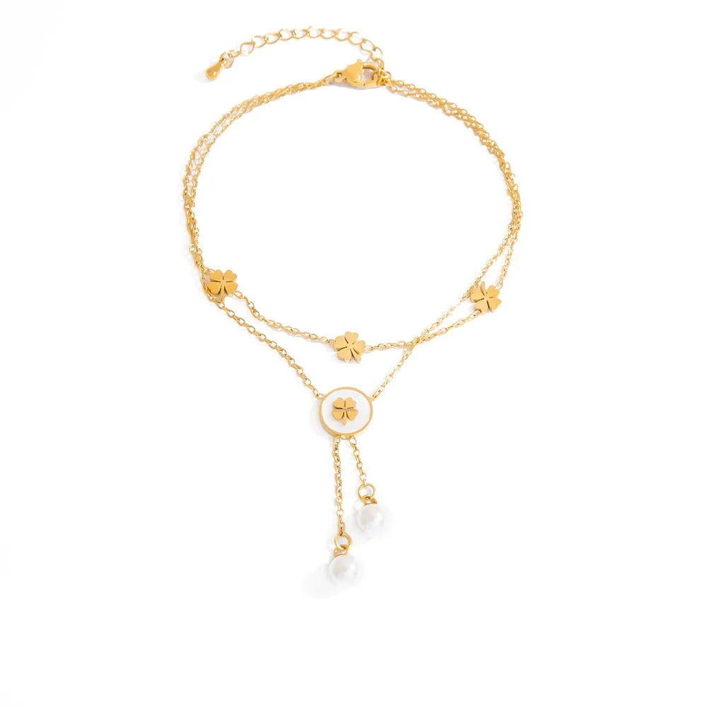 OEM Versatile 18K Gold Plated Double-Layered Anklet Stainless Steel Four-leaf Clover Tassel Pearl Fashion Cross-Border Jewelry