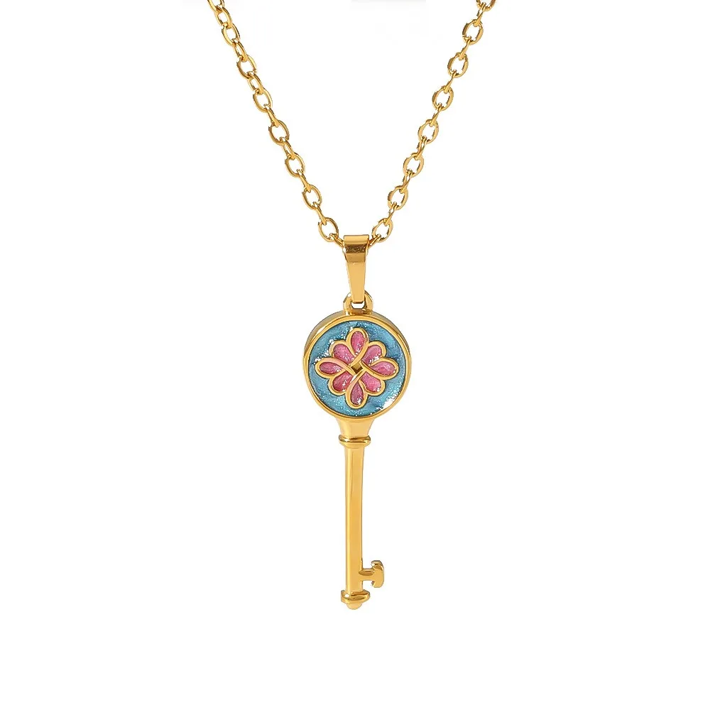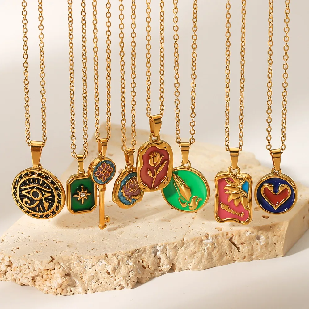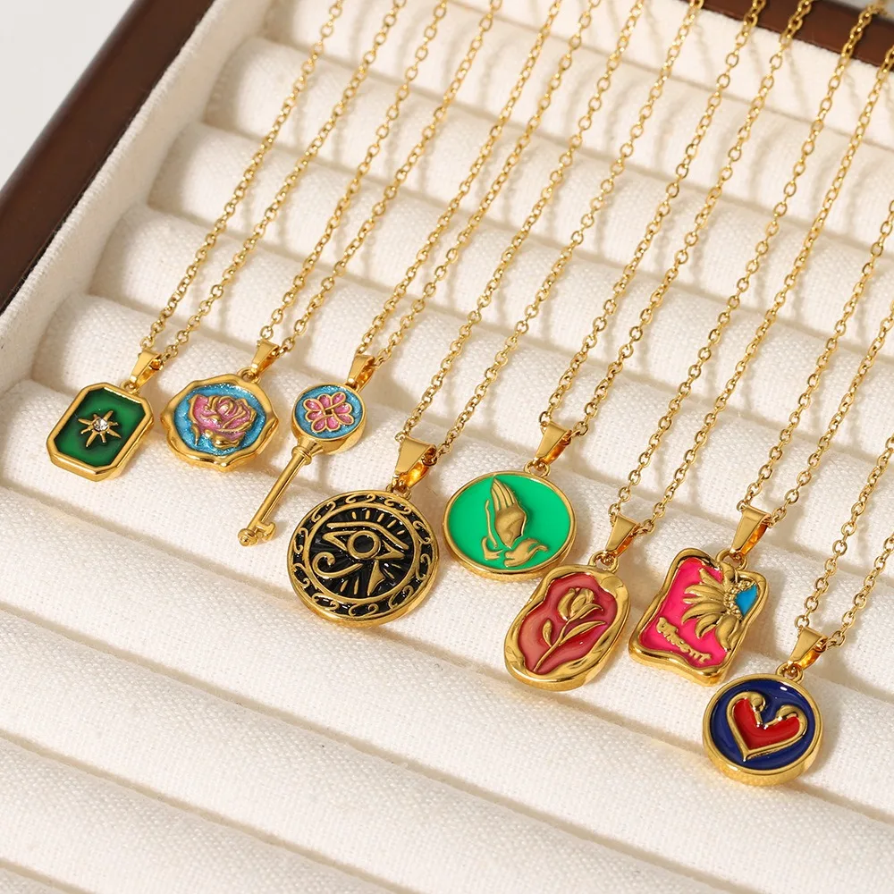 OEM Customized Stainless Steel Necklace Vintage 18K Gold Plated Enameled Heart Rose Eye Star Pendant Zircon Jewelry for Women
