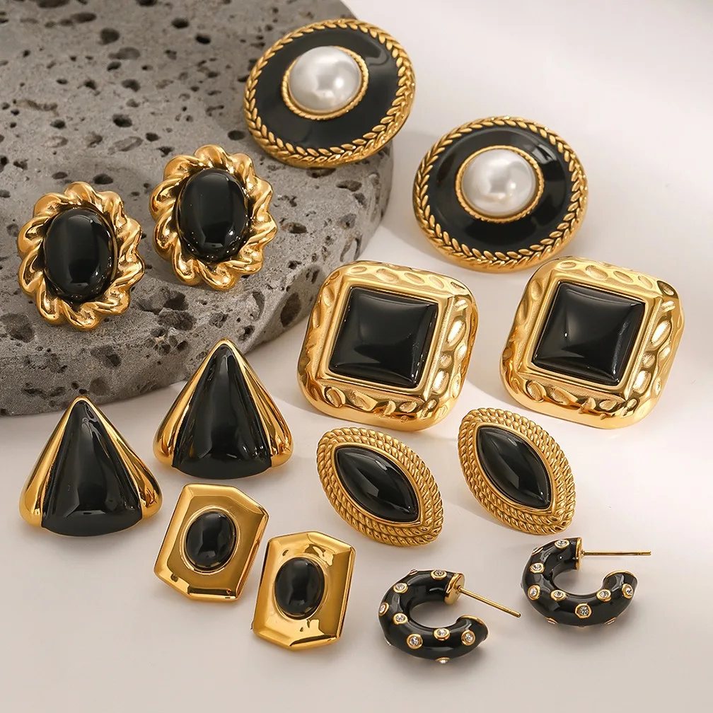 Ins Hypoallergenic Black Agate Stud Earrings Gold Plated Stainless Steel Geometric Chunky Statement Jewelry