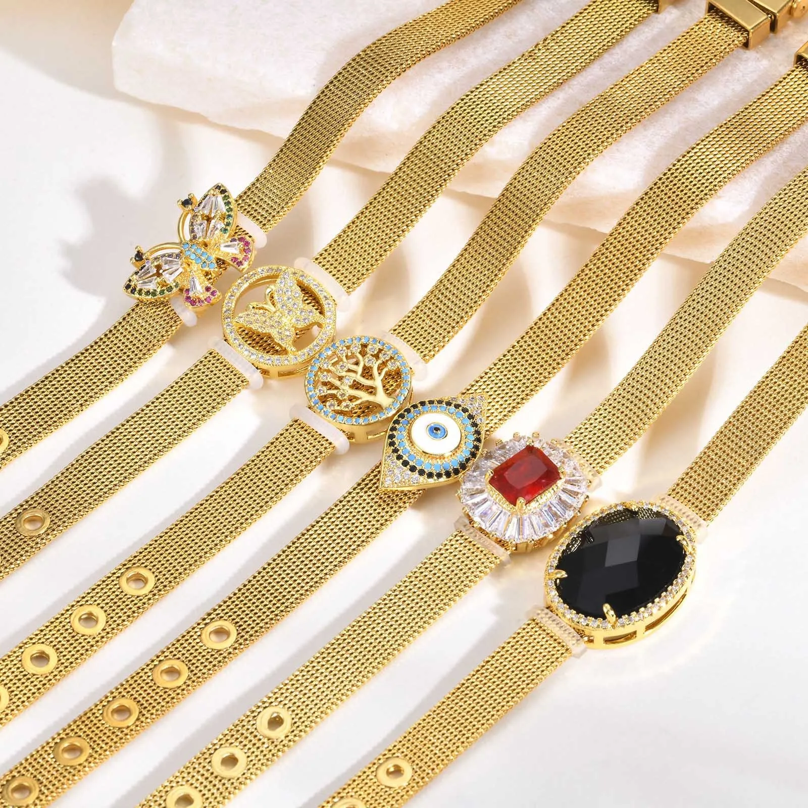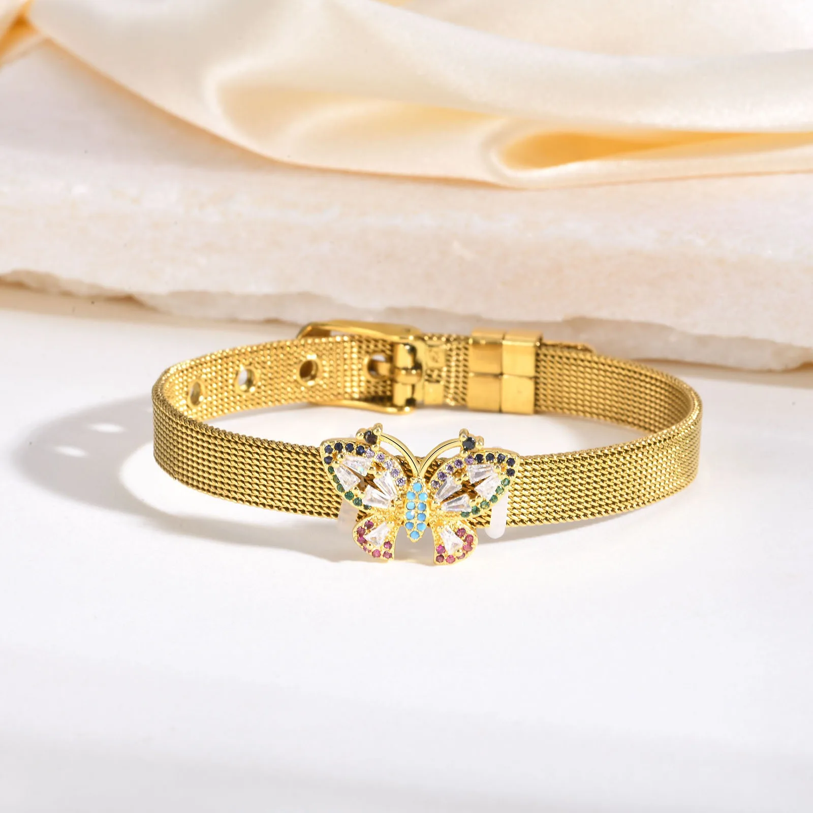 Personalized European Trendy Stainless Steel Bracelet for Women Square Zircon Butterfly Tree Life Mesh Wristband for Gifts