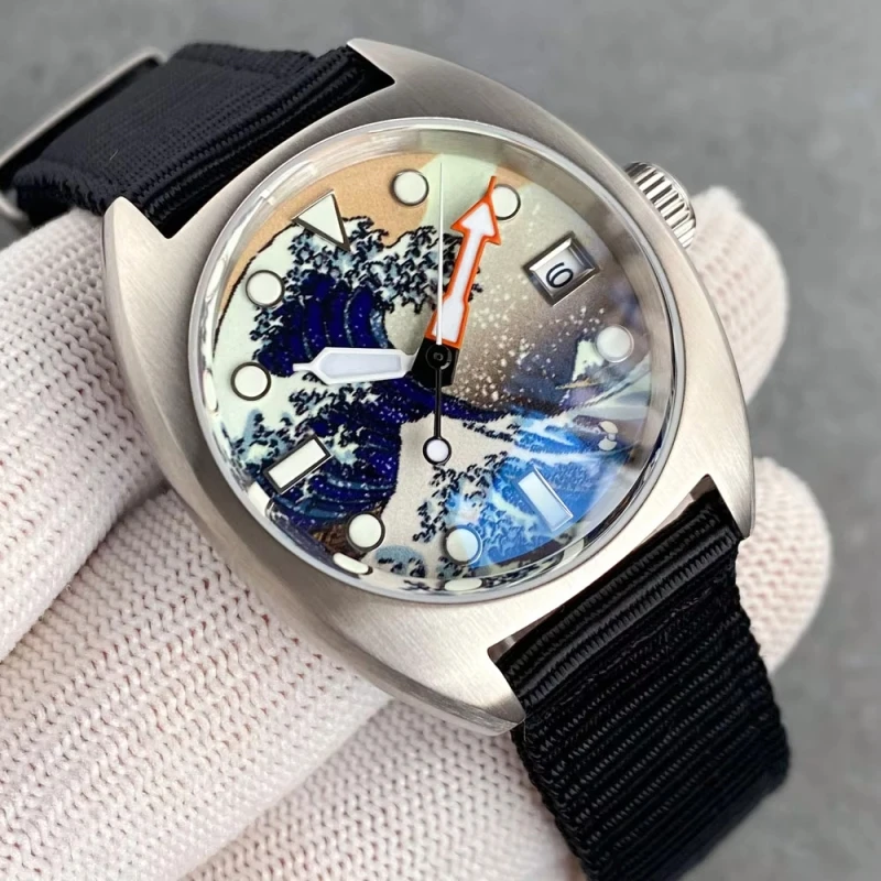 OEM Customized Hot Sale 36mm Green Luminous Wave Dial Sapphire Diver Waterproof Men's Automatic Mechanical Watch Brown Strap