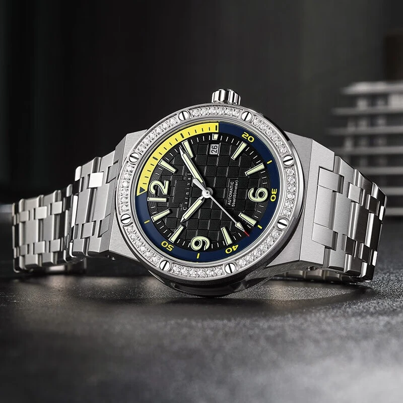 OEM Custom New Design Color Diamond Bezel Mechanical Movement Business Men's Watch Automatic Watch With Silver Band