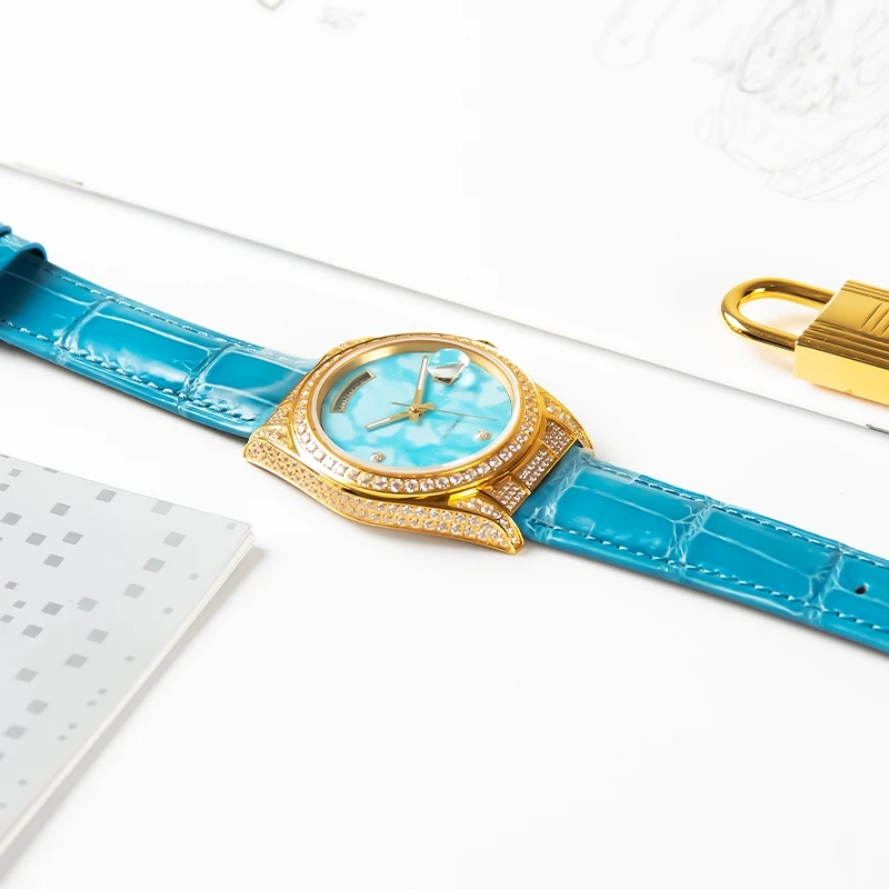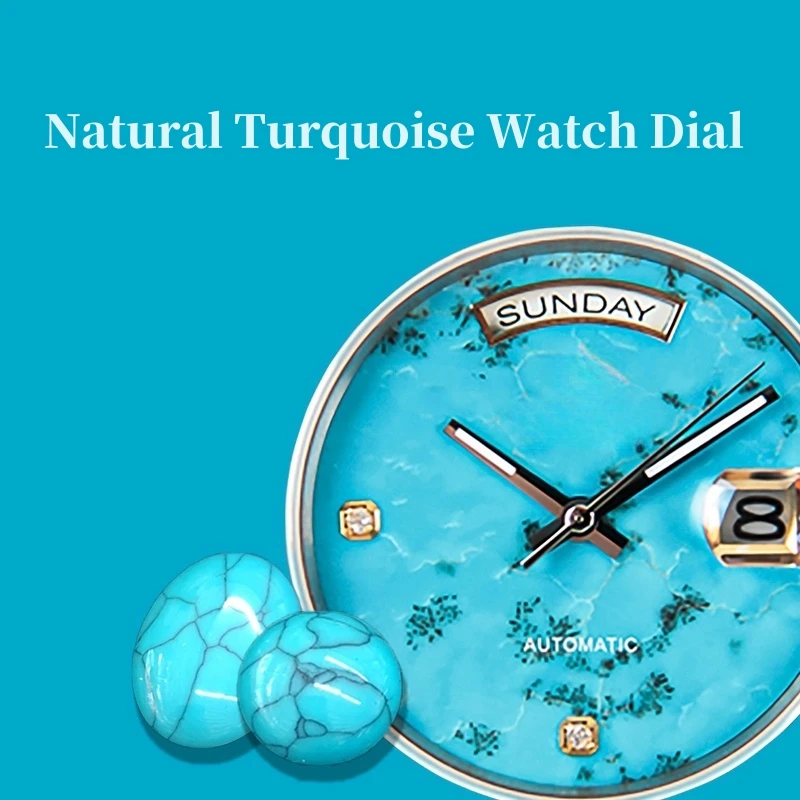 Custom Luxury Pure Natural Turquoise Men Watch Full Diamond Automatic Mechanical Steel Watch for Gemstone Tourqouise Dial