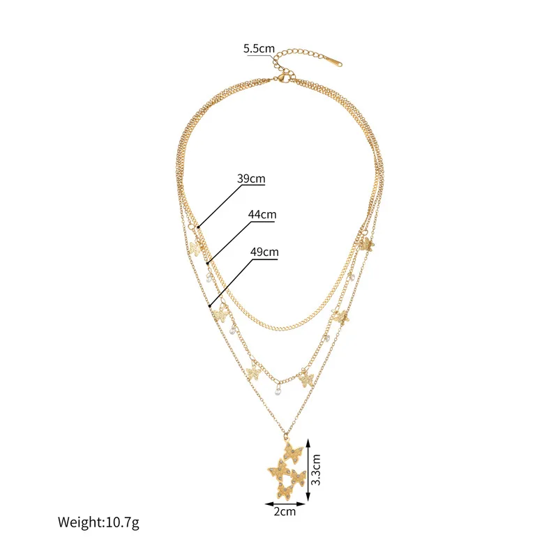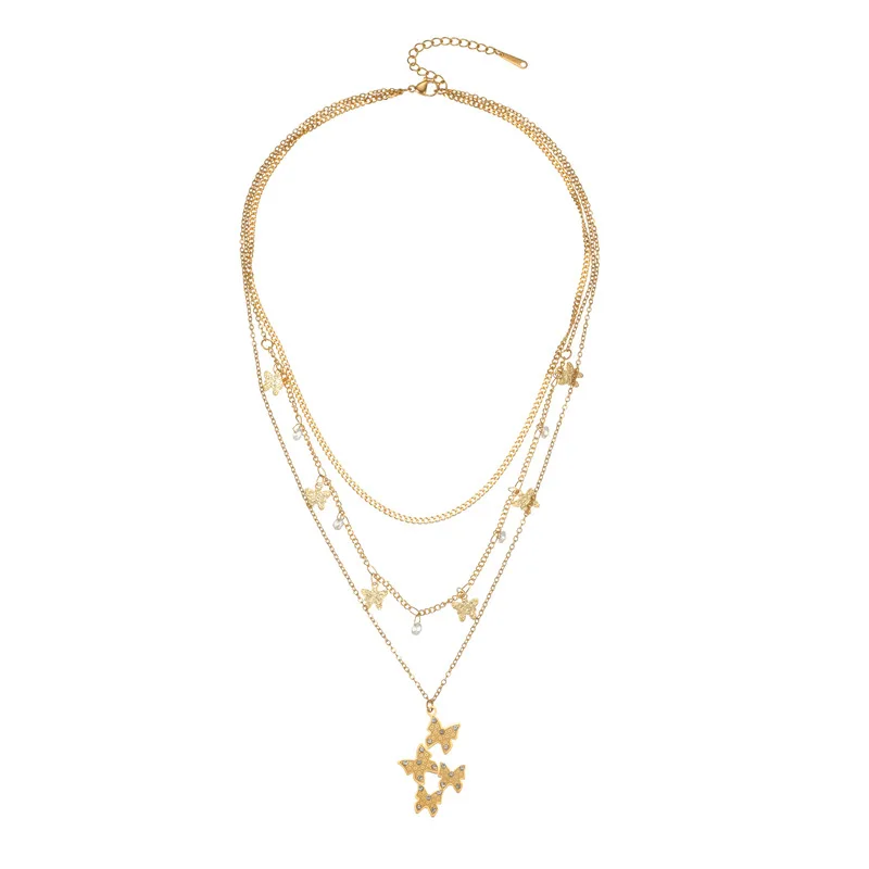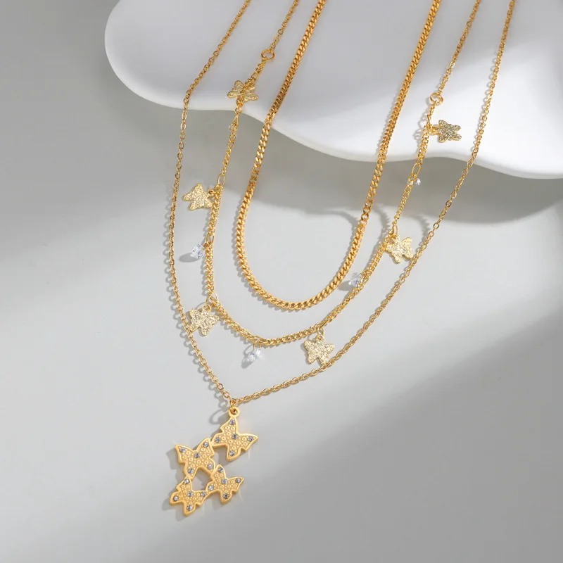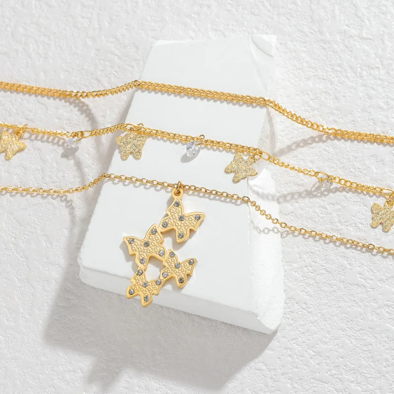 Layered Butterfly Necklace 18K Gold Plated Stainless Steel Zirconia Pendant Light Luxury Jewelry Gift for Women