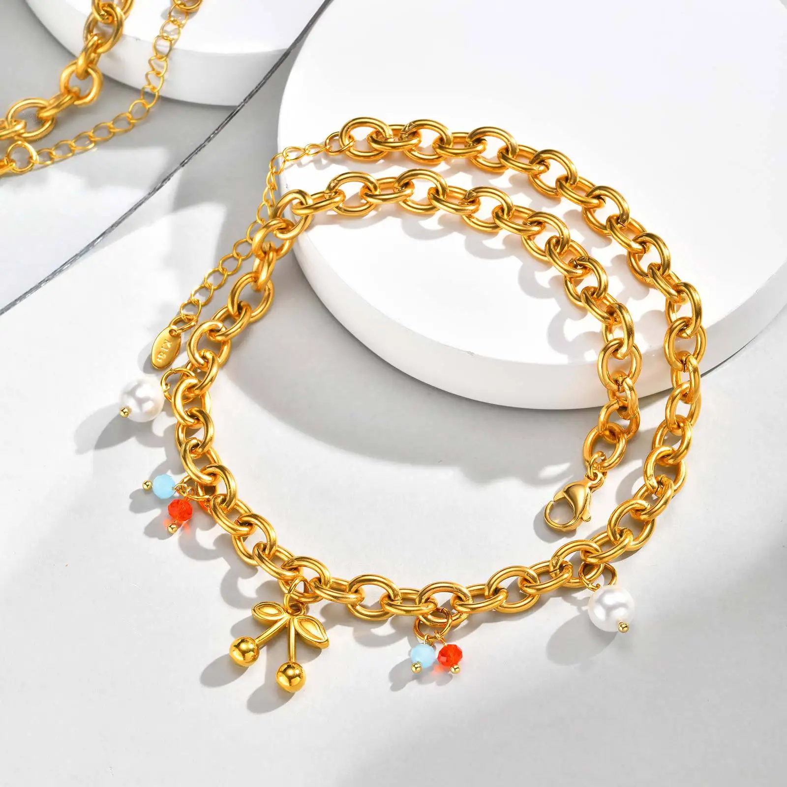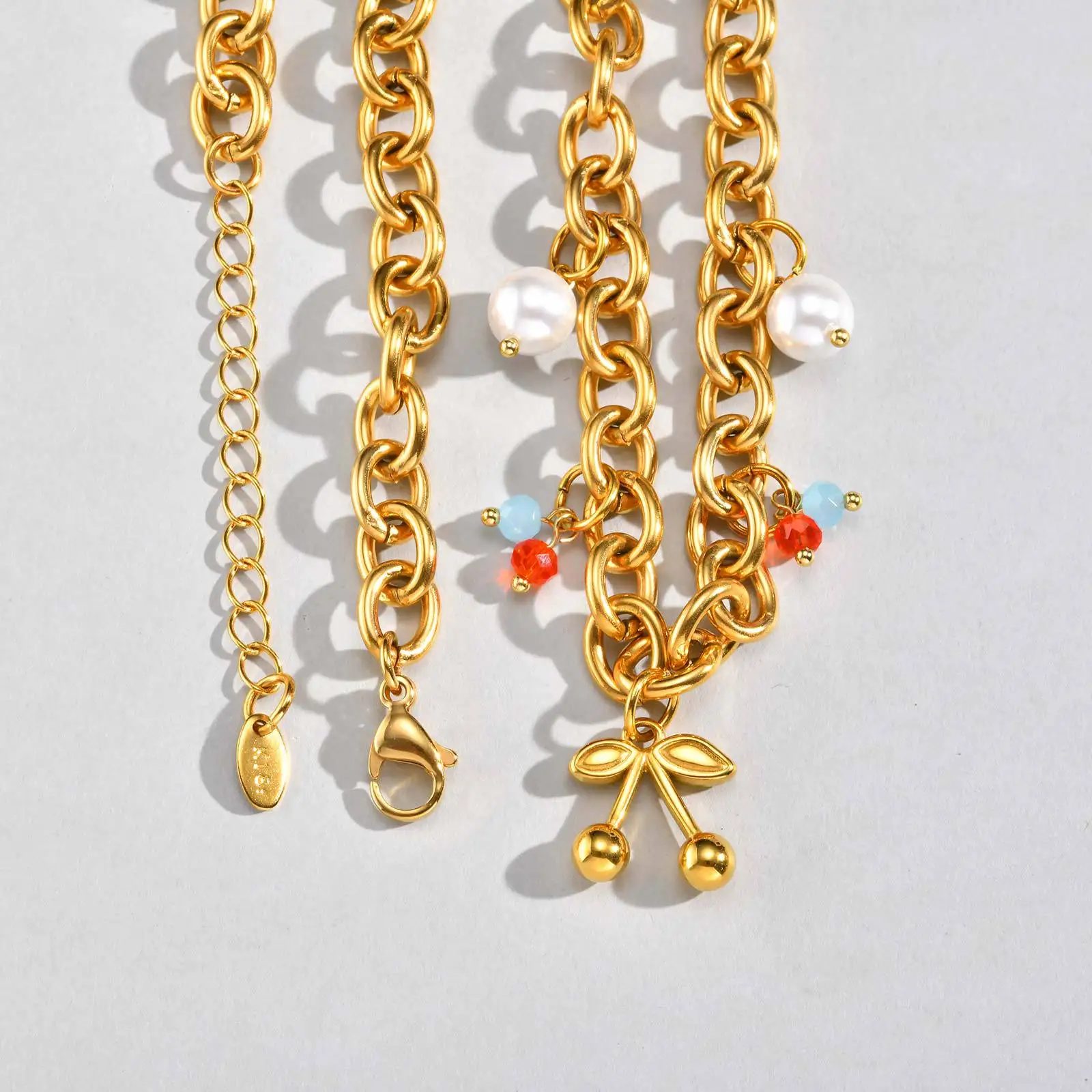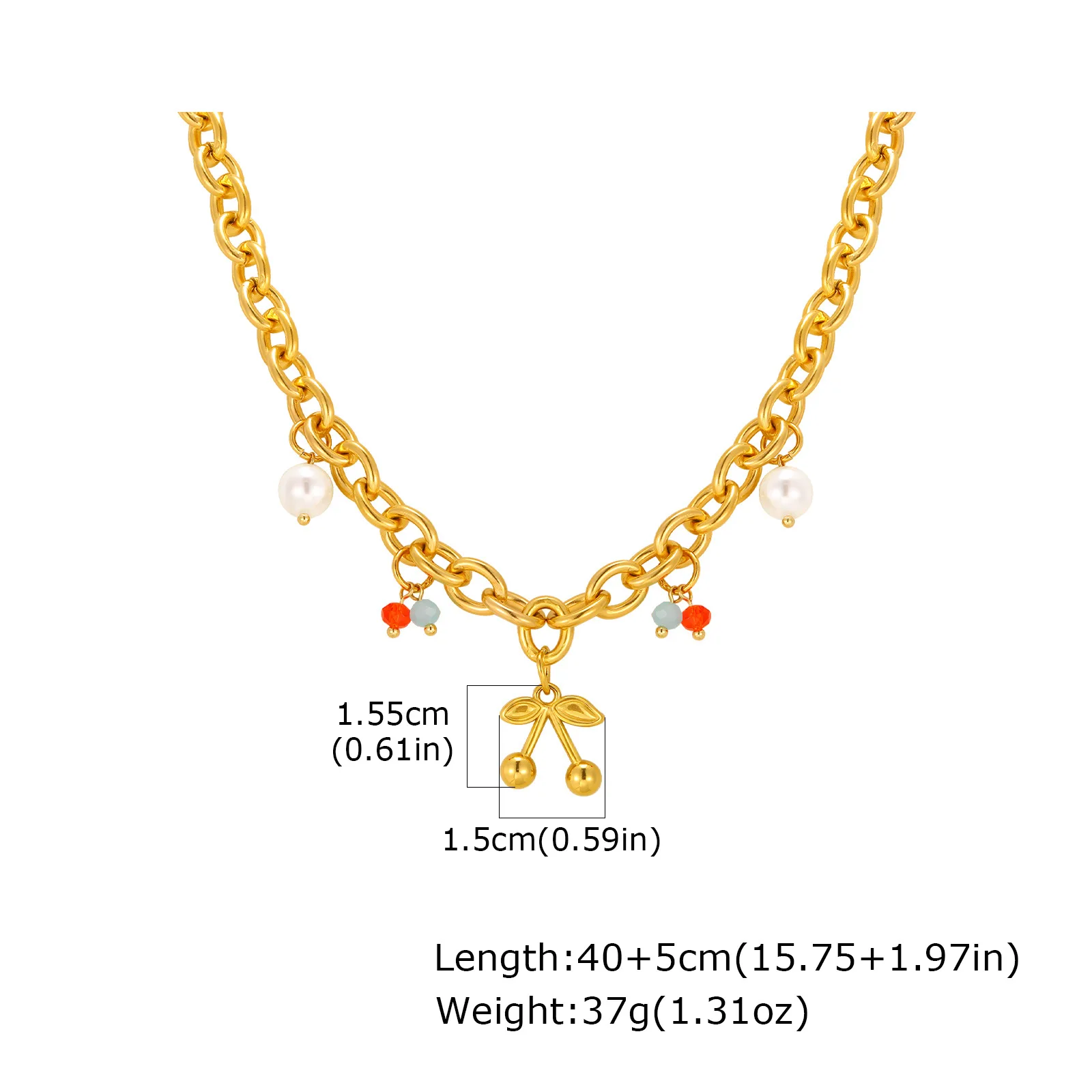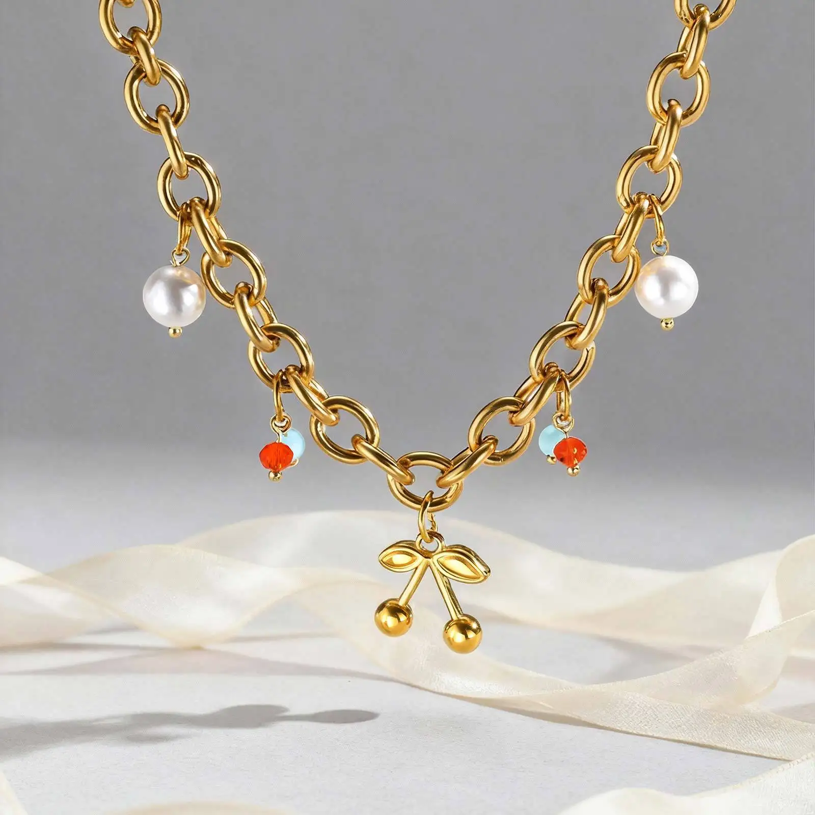 Gold Plated Cherry Pendant Necklace Imitation Pearl Crystal Beads Chain Light Luxury Sweet Style Jewelry Wholesale