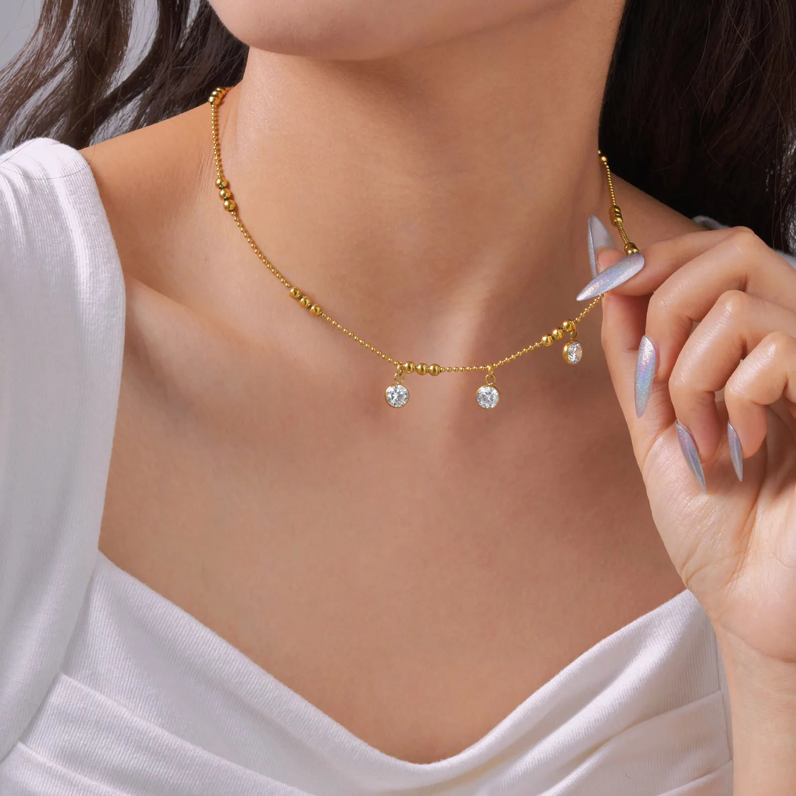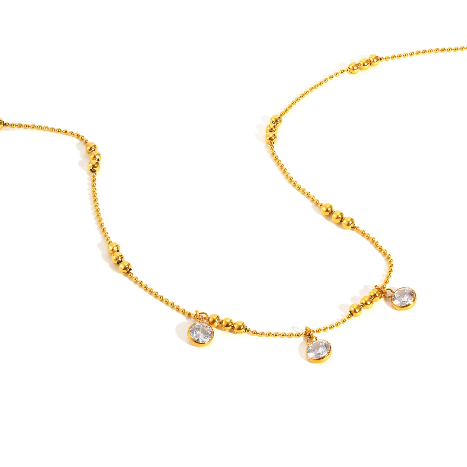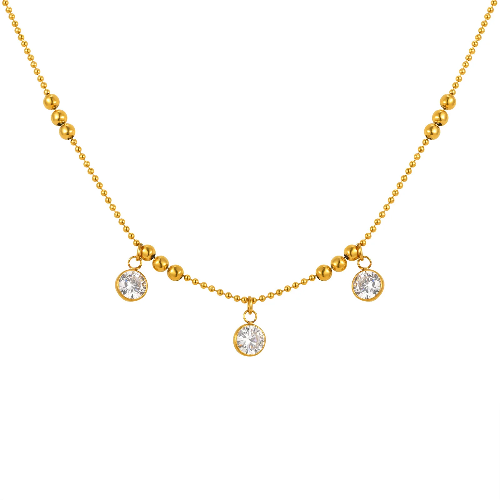 Fashion Jewelry Women Gold Plated Round Bead Chain Necklace Stainless Steel 3 Zircon Pendant Necklace