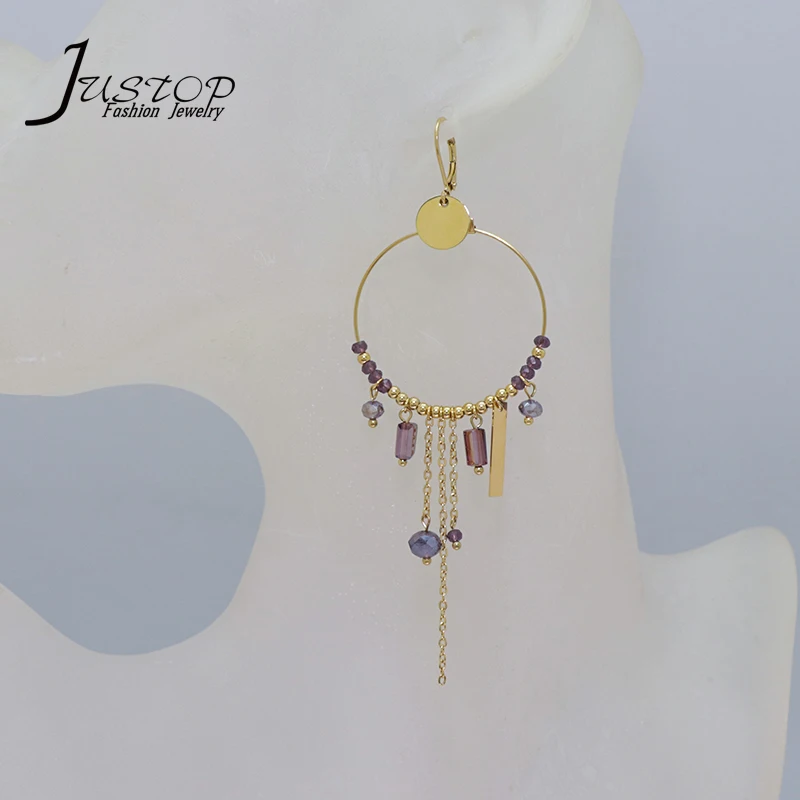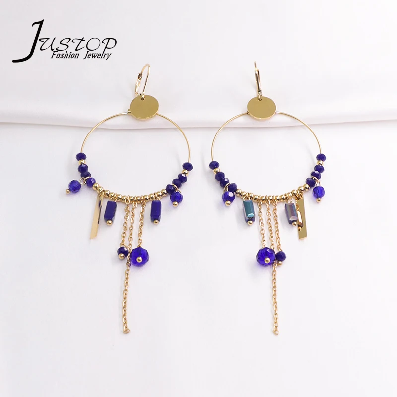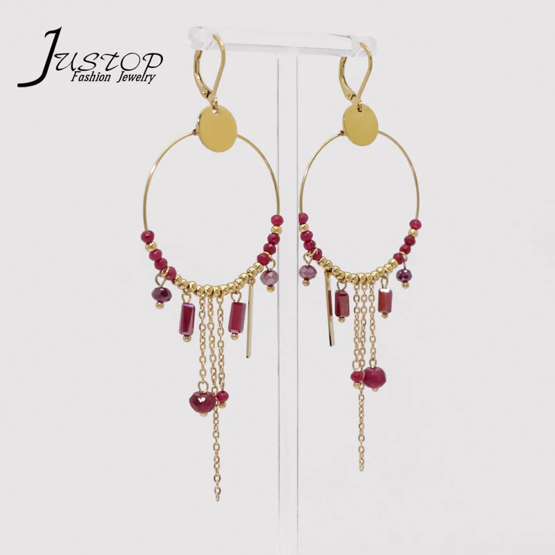 Stainless Steel Wholesale Round Statement Natural Stone Beads Red Crystal Circle Tassels Dangle Earrings