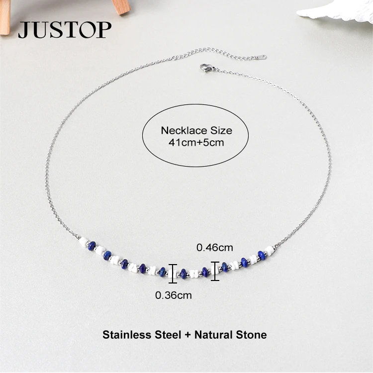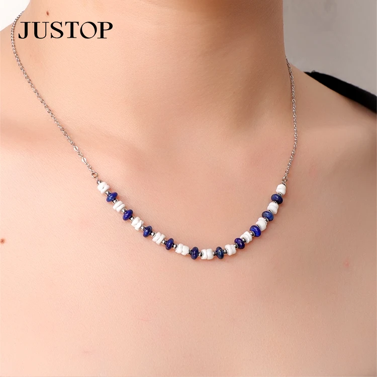 Popular Statement Women Natural Blue-veins Stone Stainless Steel Gold Bead Chain Choker Charms Necklace