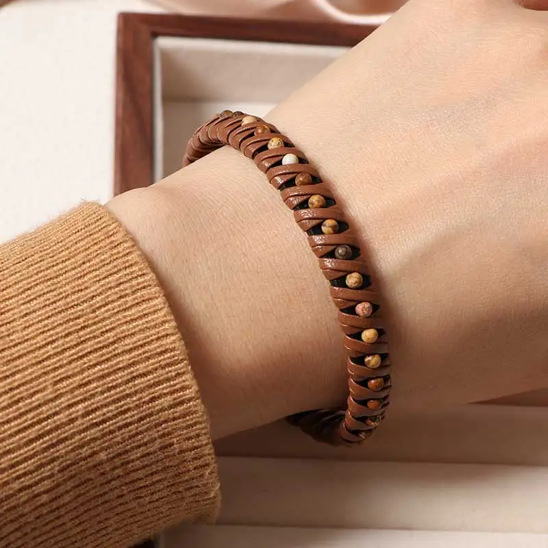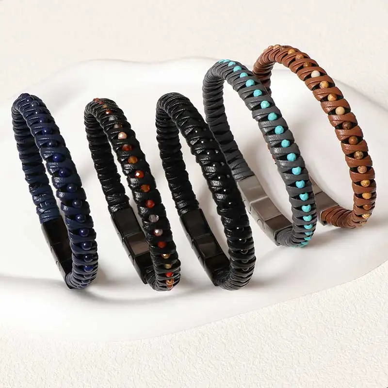 Trendy Unisex Multi-Layer Hollow round Bracelet Black Bead Leather with Stainless Steel Fashion Jewelry for Men Women for Gifts