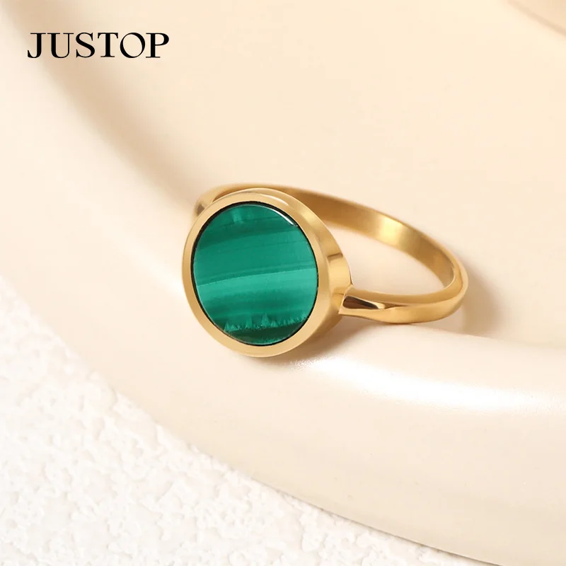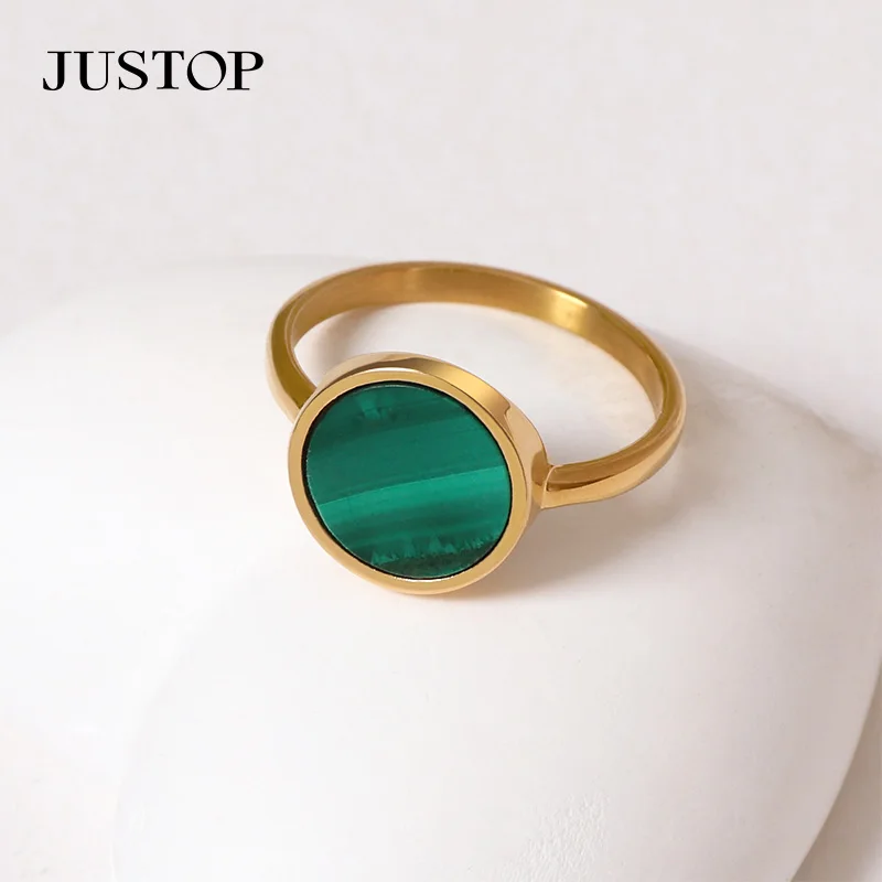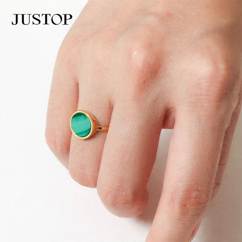 Handmade 18K Gold Plated Stainless Steel Ring with Natural Malachite Gemstone Beautiful Engagement Party Jewelry Gift Idea