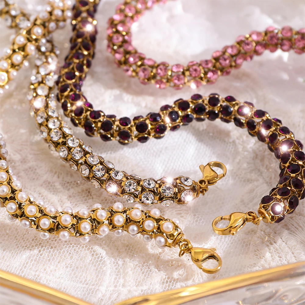 Women's Chic Elegant Sparkling Tarnish-Free Stainless Steel Bracelet Adjustable Rhinestone Bangle Pearl Crystal Trendy Jewelry