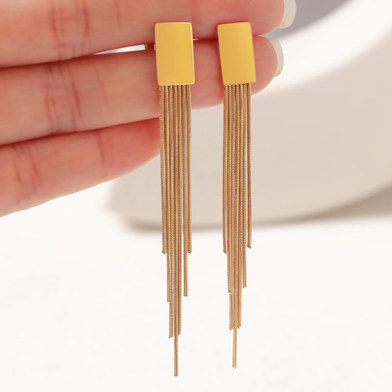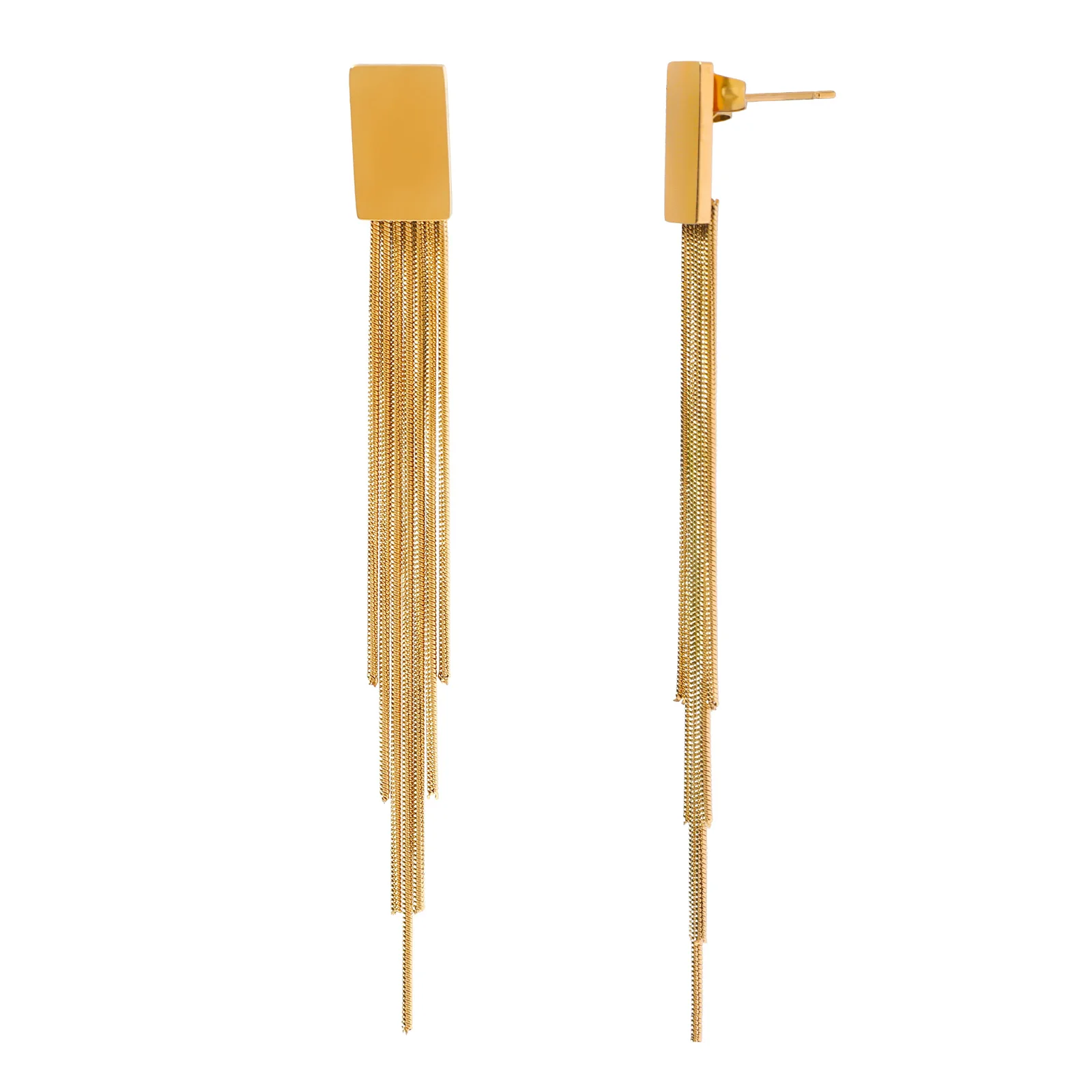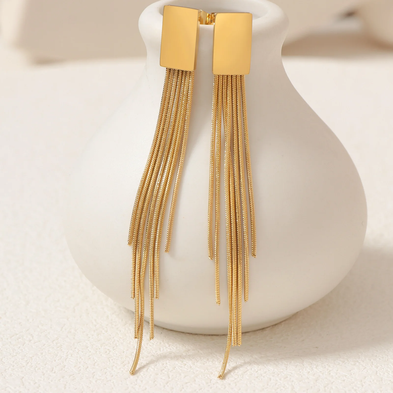 Vintage Stainless Steel Plated Real Gold Tassel Drop Earrings Factory's Trendy Long Metal Rope Chain with Waterproof Studs