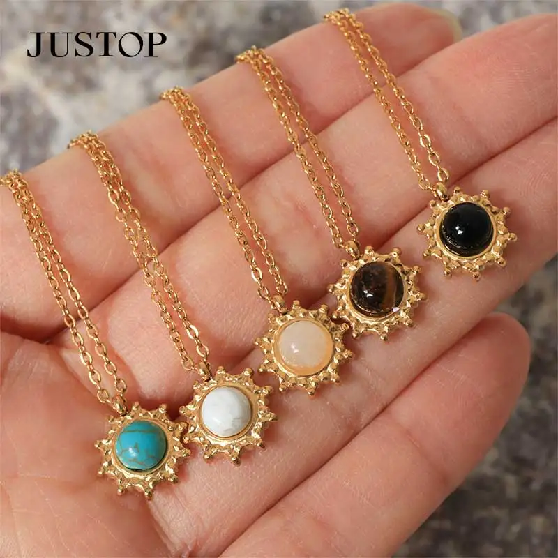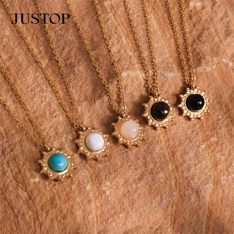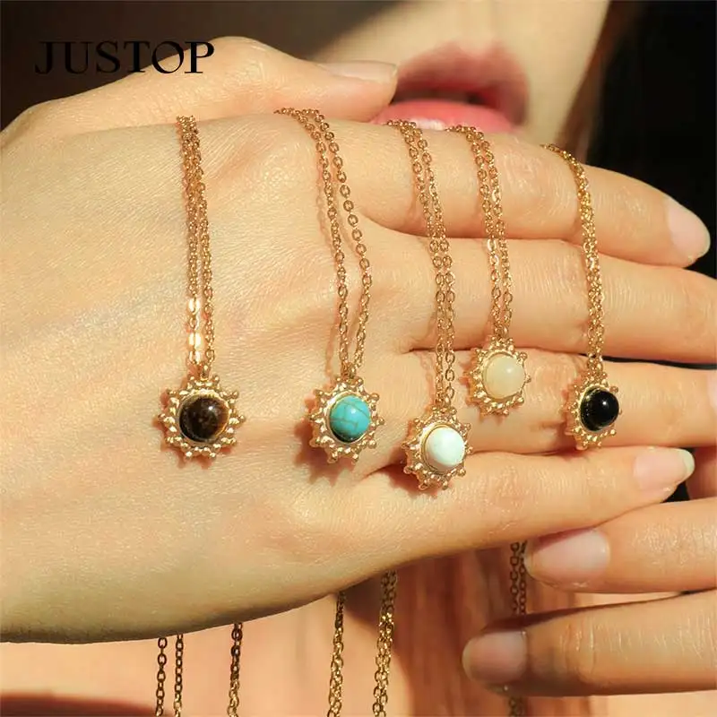 Mini Charm Natural Birthstone Turquoise 18K Gold Plated Stainless Steel Pendant Necklace Delicate Gemstone Link Chain Jewelry
