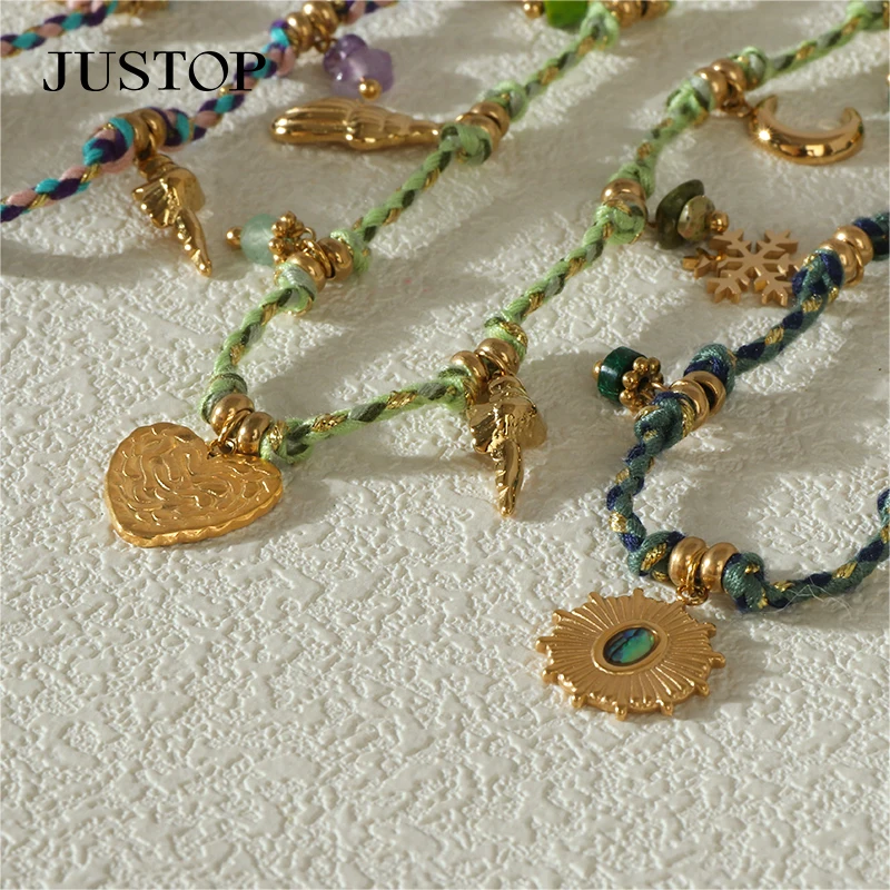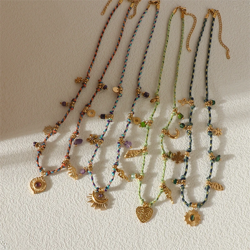 Lot of Charm Necklace Evil Eye Sun Heart Moon Shell Pendant Braided Strand Necklace 18K Gold Plated Fashion Rope Necklace