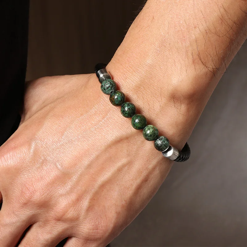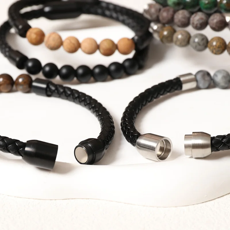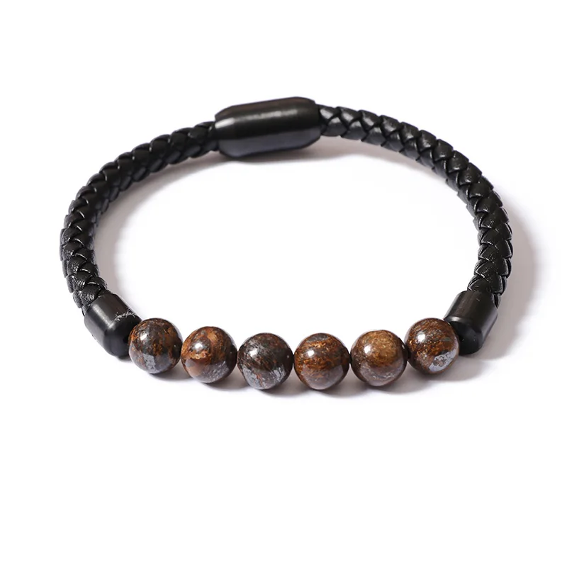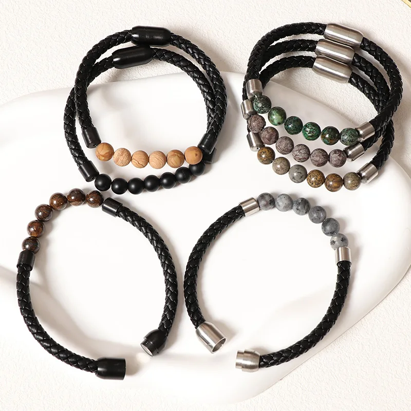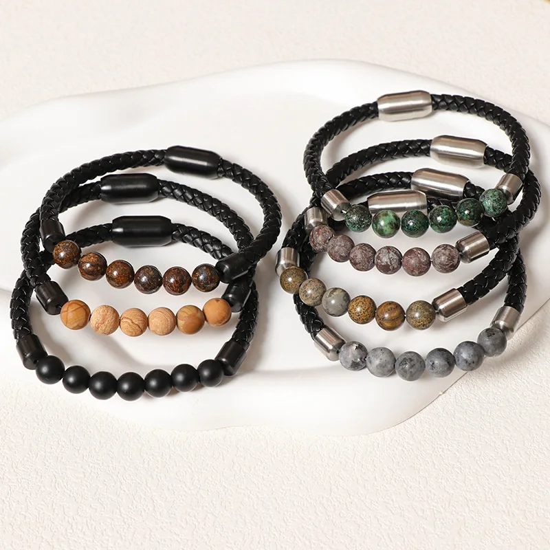 Leather Bracelet Bangle for Man European and American Fashion Natural Volcanic Stone Beaded Bracelet Hand-woven Jewelry