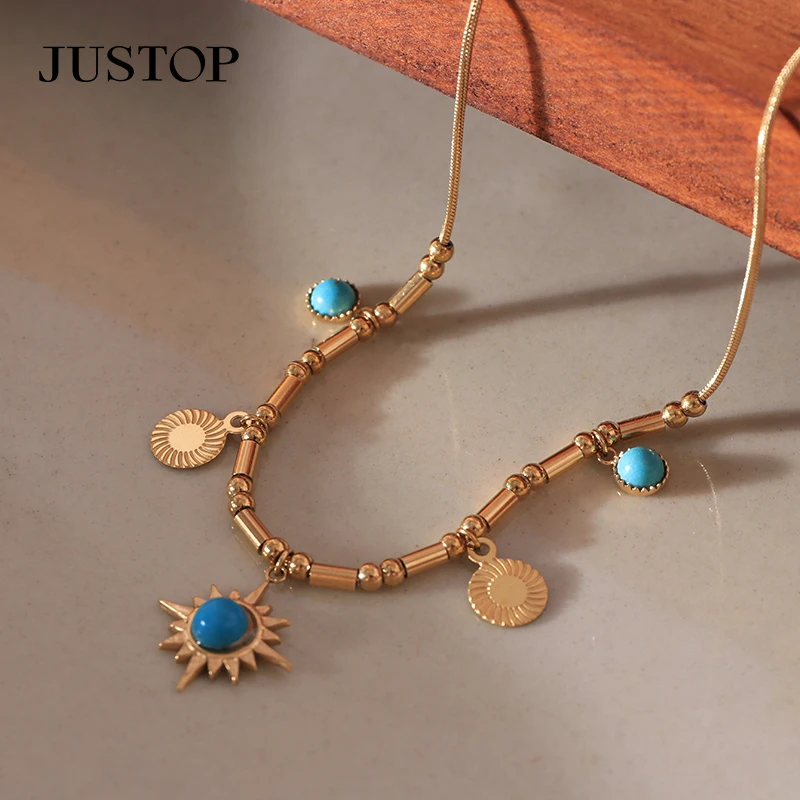Hypoallergenic Stainless Steel Turquoise 18K Gold Plated Strand Necklace Glamour Big Evileye Pendant Collar Daily must Have