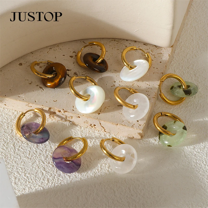 18K Gold Plated Stainless Steel Huggies Hoop Earrings Pearl Pink Jade Stone Ear Charms Unisex Trendy Accessory for Parties