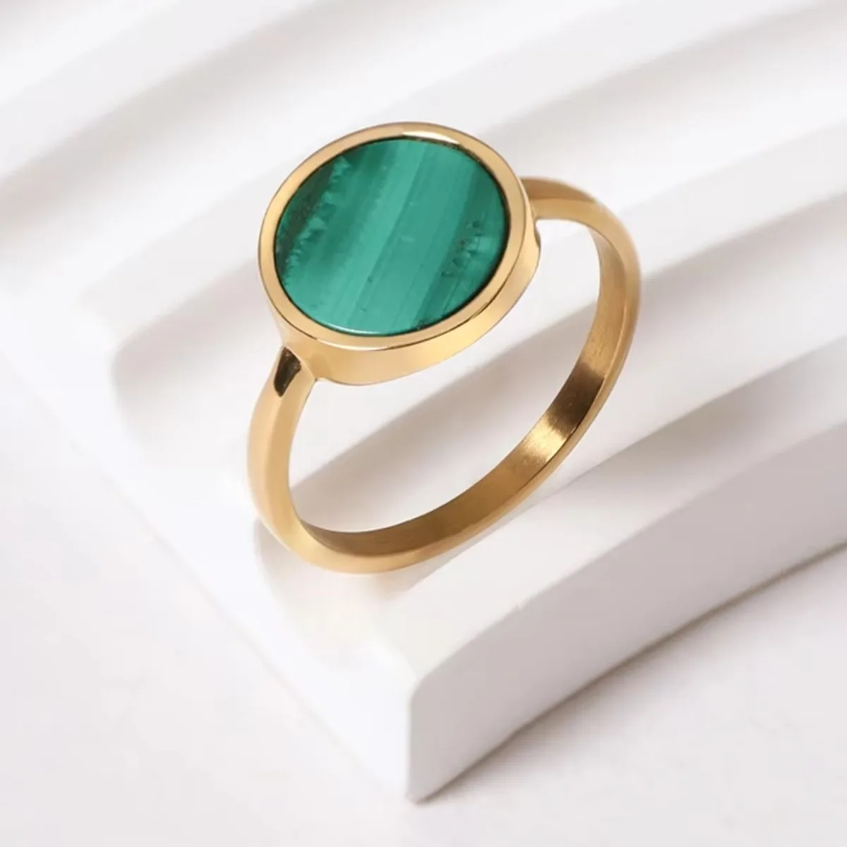 18K Gold & Rose Gold Plated Stainless Steel Dainty Ring Beautiful Natural Green Malachite Flat Gemstone Women's Jewelry
