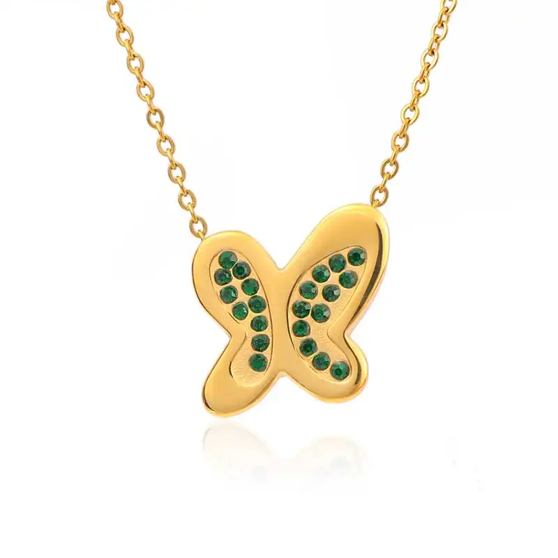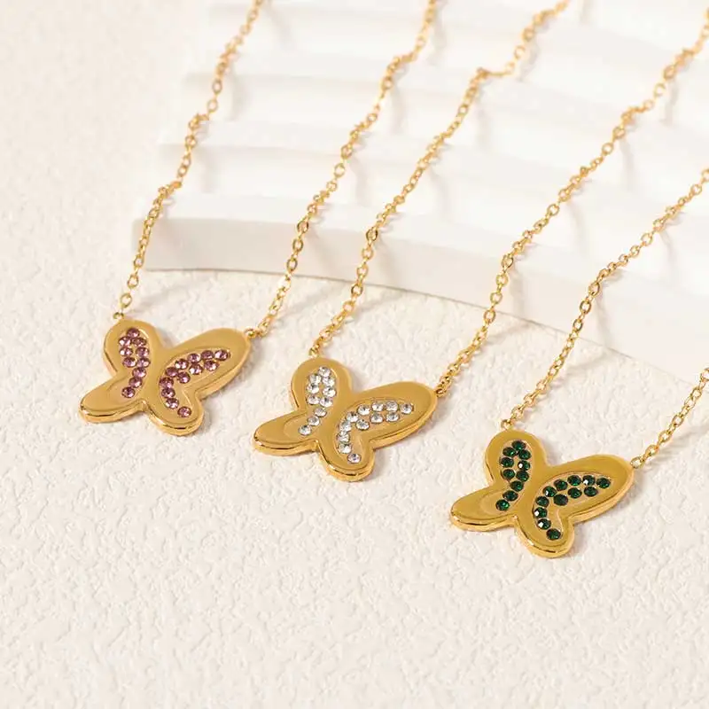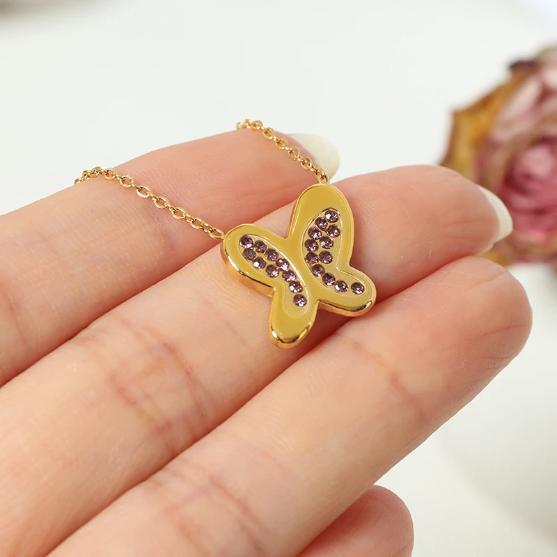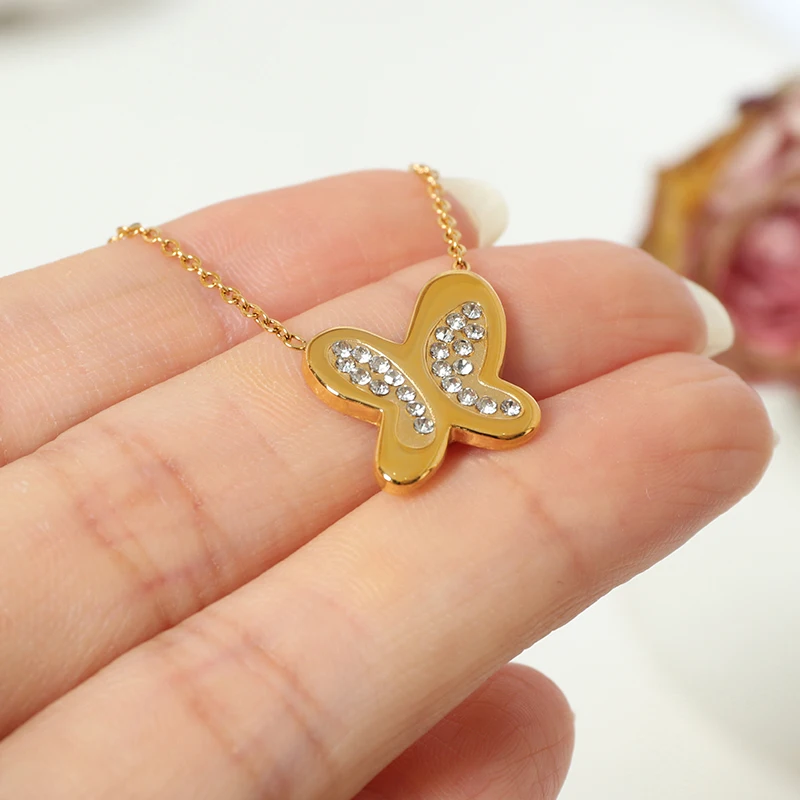 18K Gold Plated Trendy Butterfly Pendant Necklace with Link Chain Crystal Stainless Steel Charm Fashionable Jewelry for Women