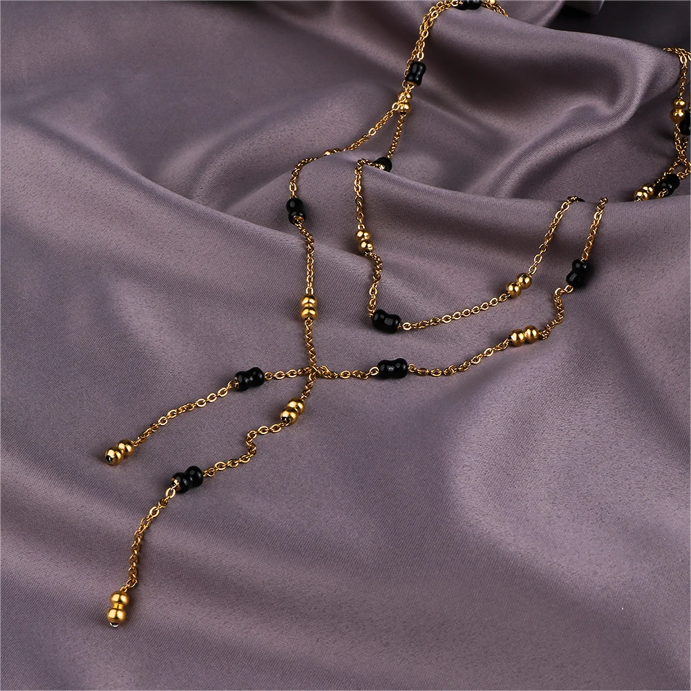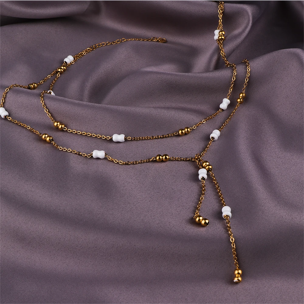 18K Gold Plated Double-Layer Ball Beam Link Chain Vintage Style Stainless Steel with Quartz Perfect Necklace Gift for Women