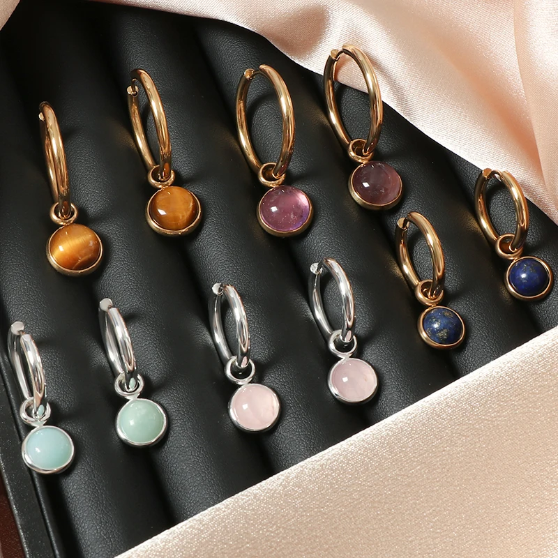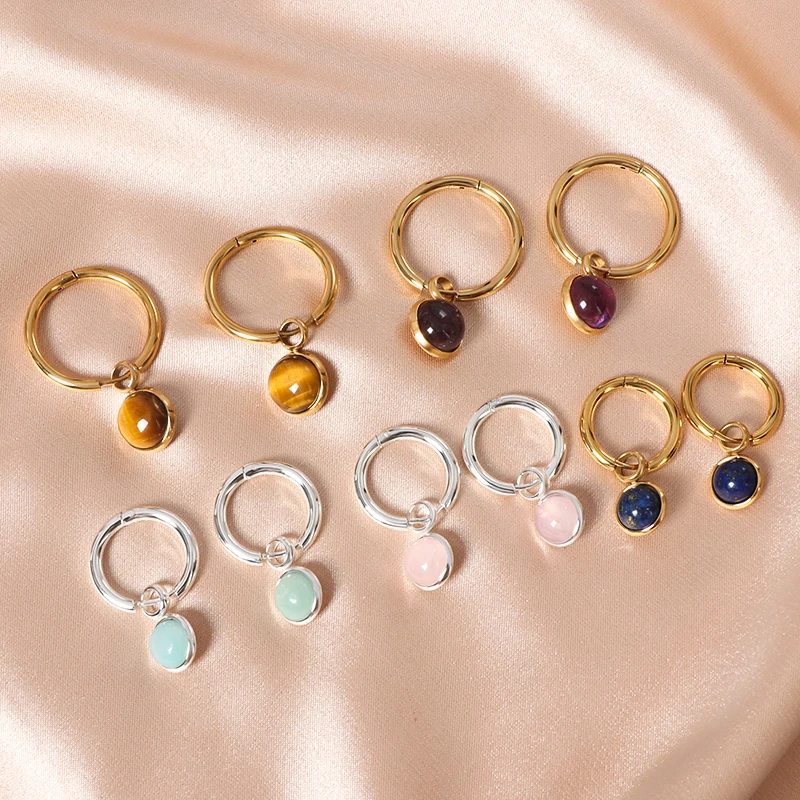 Fashion Trendy Tiger Eye Natural Stone Drop Earring Hoop Pendant Stainless Steel 18K Gold PVD Jewelry Silver Color Jade Earrings