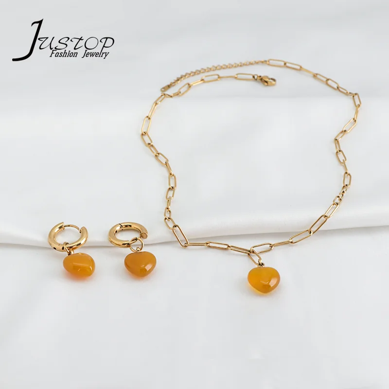 Fine Jewelry High Quality Oval Link Chain Natural Stone Heart Drop Ladies Necklaces Set With Earring Jewelry for Women