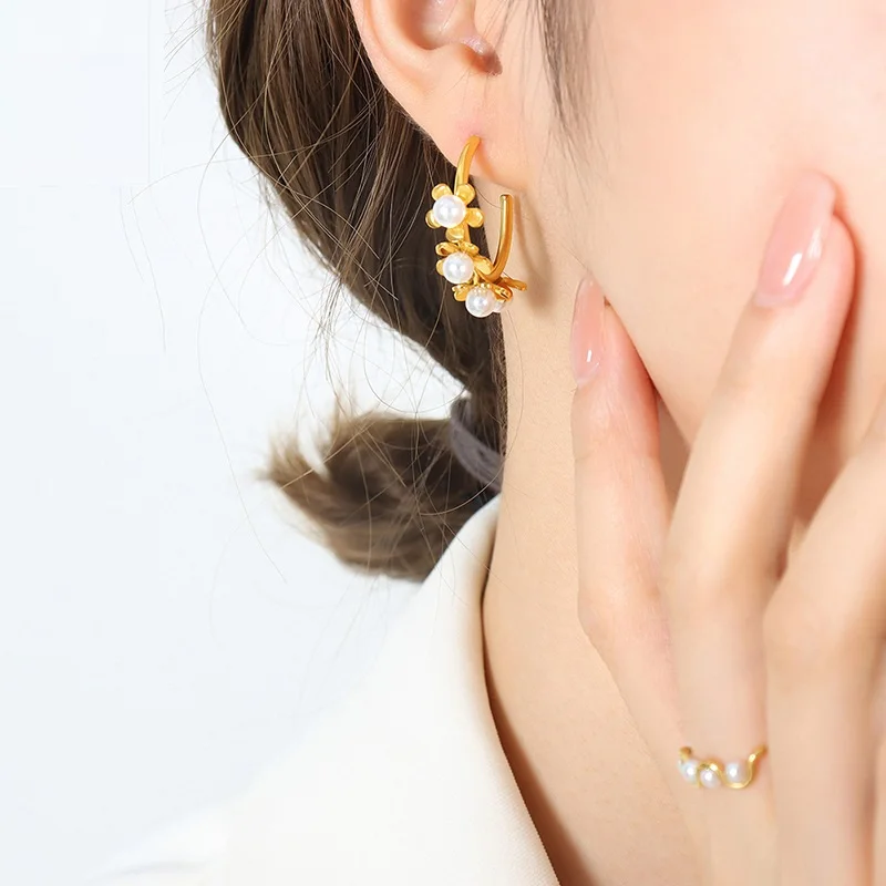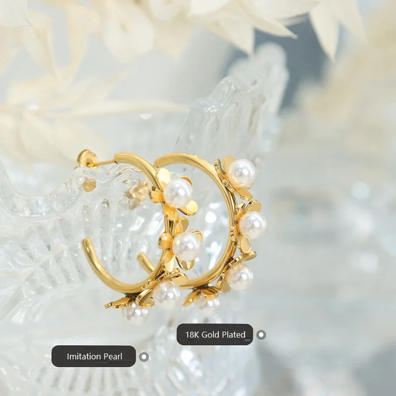 Fine Fashion Small Huggie Hoop Earings 18k Gold Plated Stainless Steel Jewelry Flower Pearl Hoop Earrings for Women