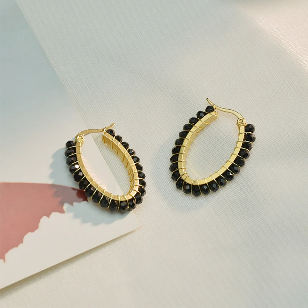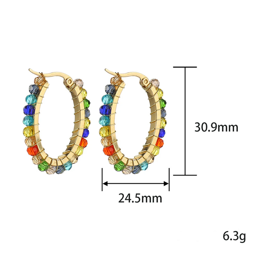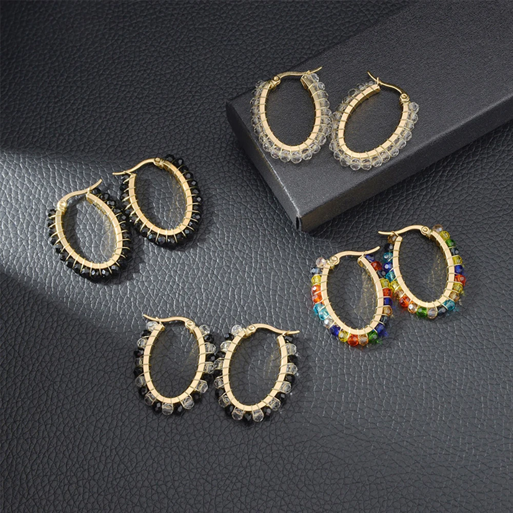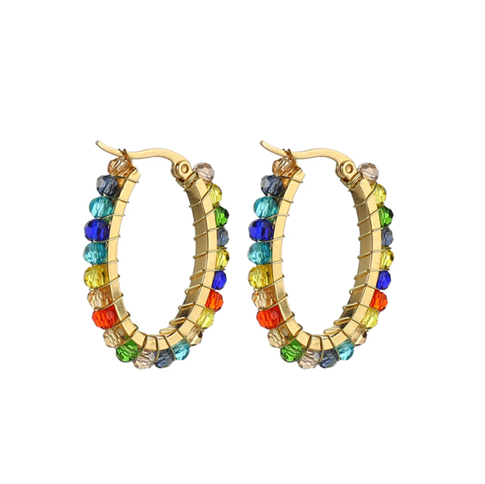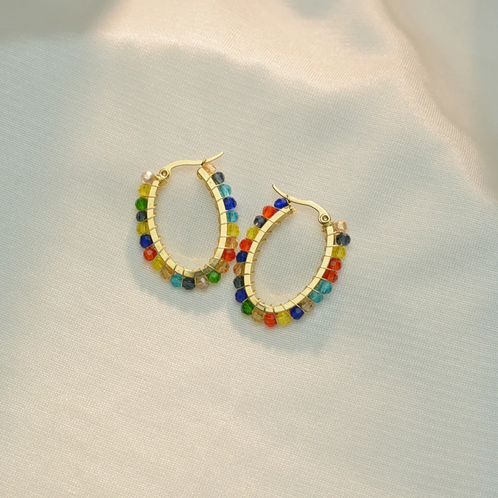 YUKAM Fashion Jewelry Stainless Steel Seed Bead Earrings Colorful Glass Crystal Rhinestone Beaded Oval Round Hoop Earrings Women