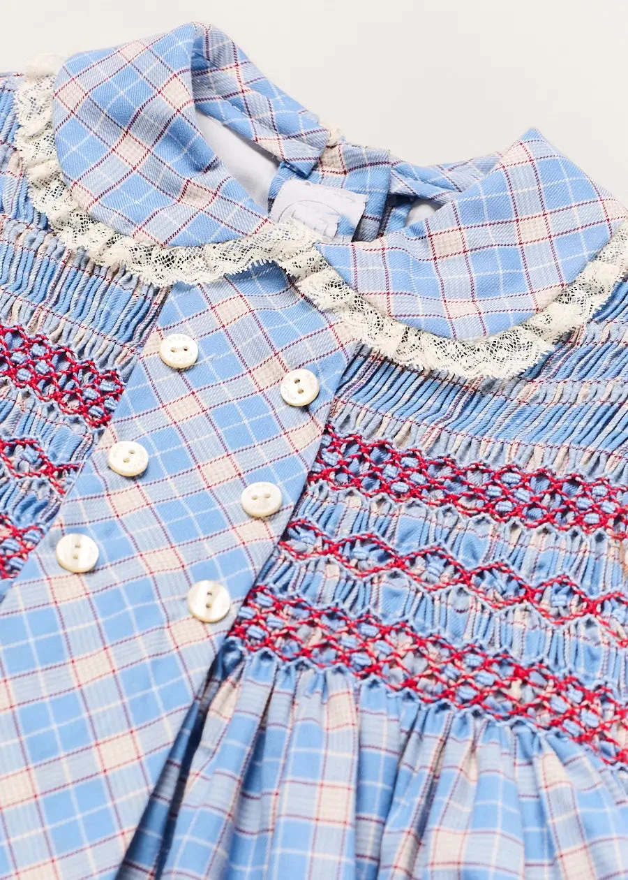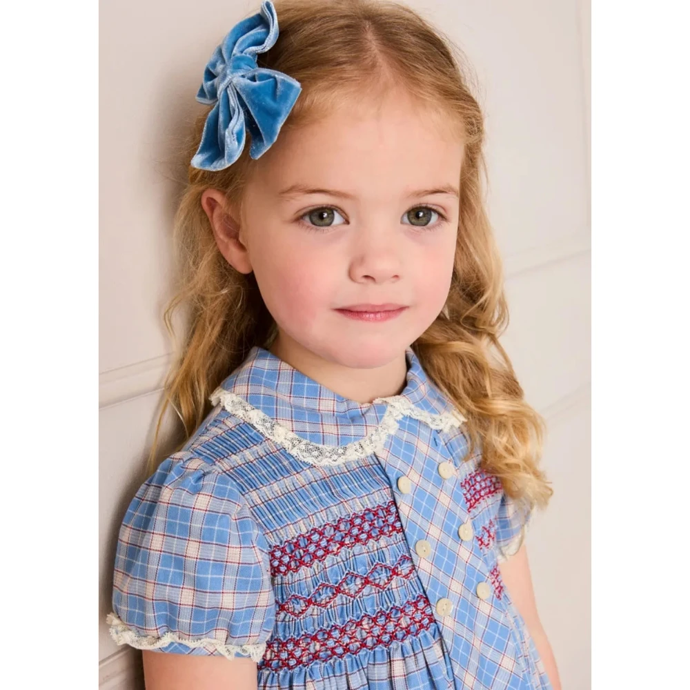 Customized OEM and ODM Elegant White Blue White Plaid Pattern Peter Pan Collar Short Puff Sleeves Girls Dress Outfit