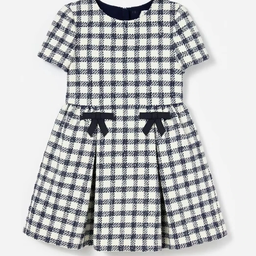 Customized OEM and ODM Elegant Autumn and Winter Short Sleeves Navy and White and Navy Plaid Pattern Girls Dress