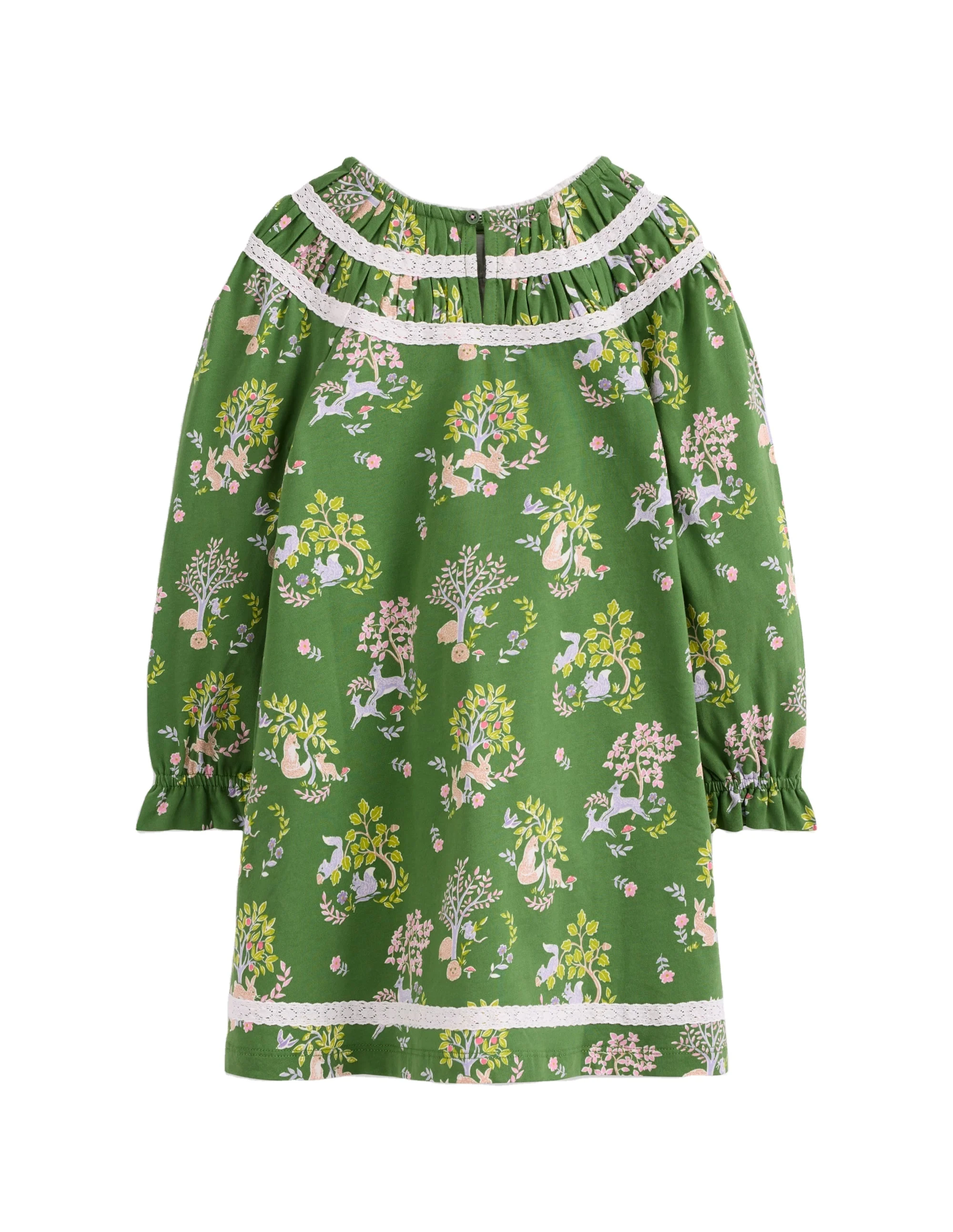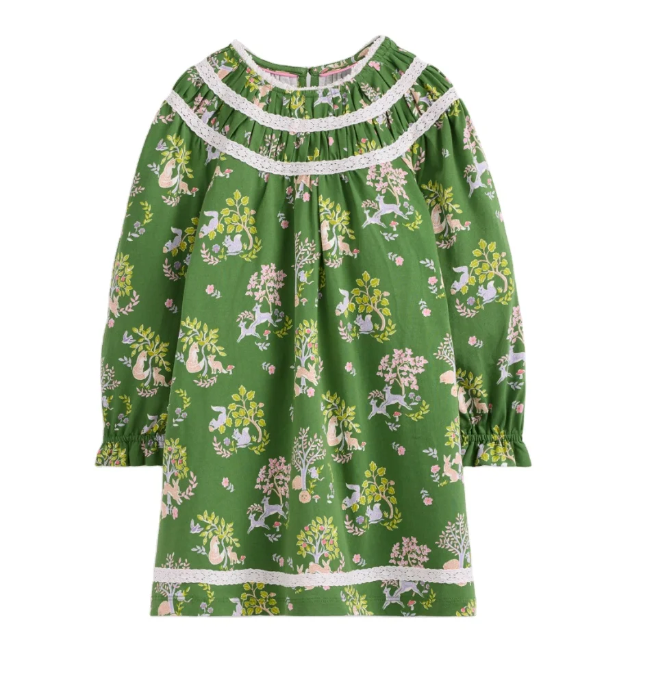 Autumn Children Girls O-Neck Lace Breathable Green Print Maxi Length Long Sleeve Velvet Polyester/Cotton Dresses