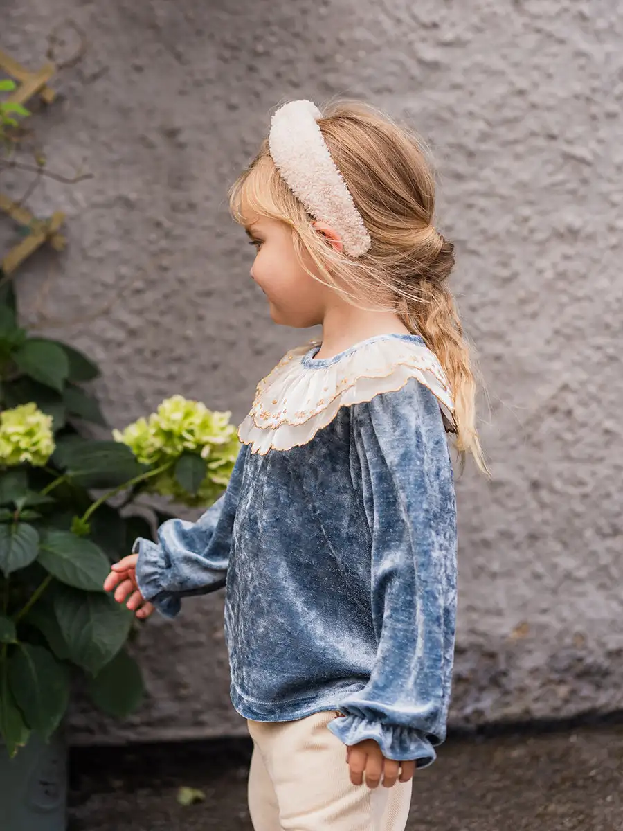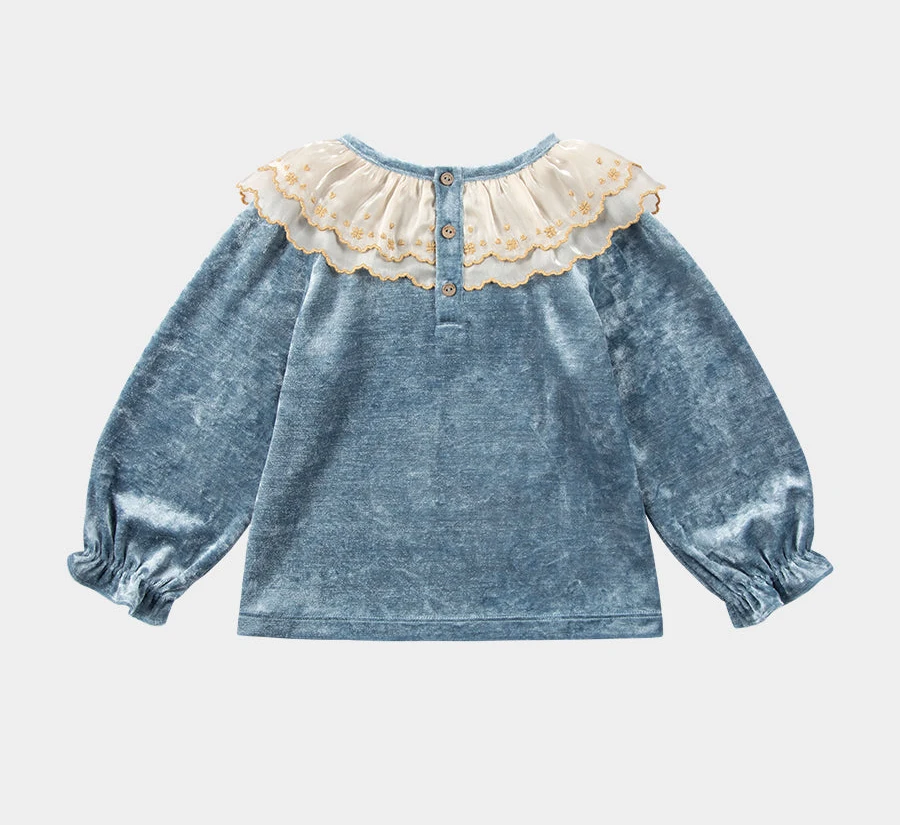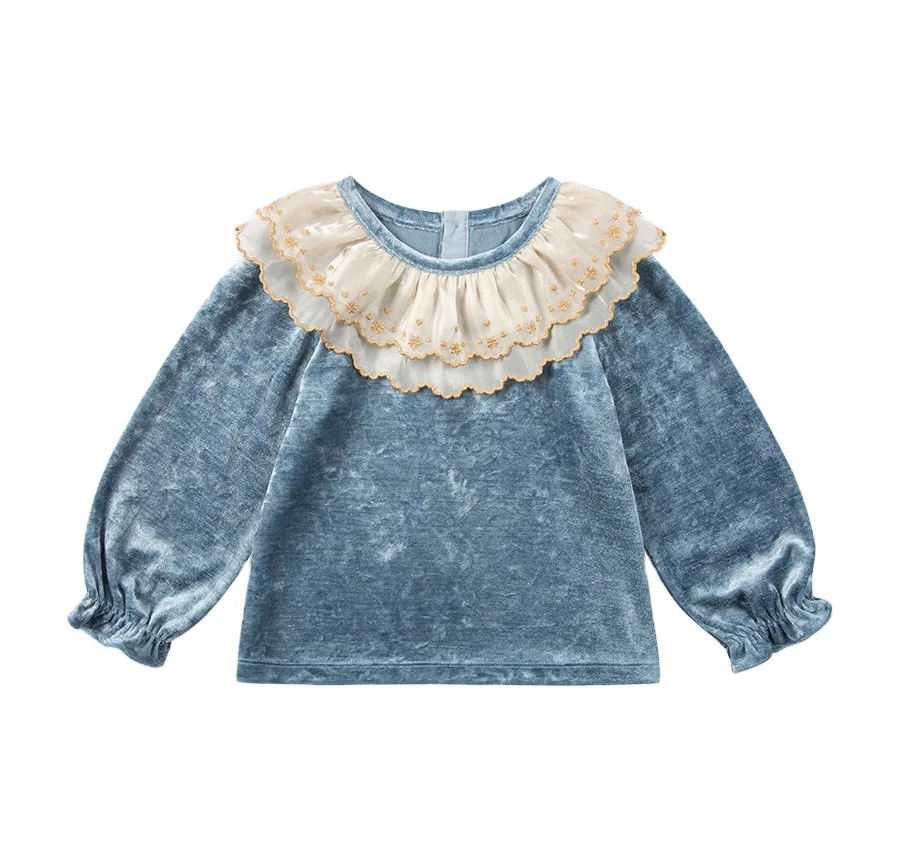 Fashion Kids Clothes OEM & ODM Velvet Tops for Girls Casual Ruffles Long Sleeve Lace Organza Collar Cotton Shirts Latest Design