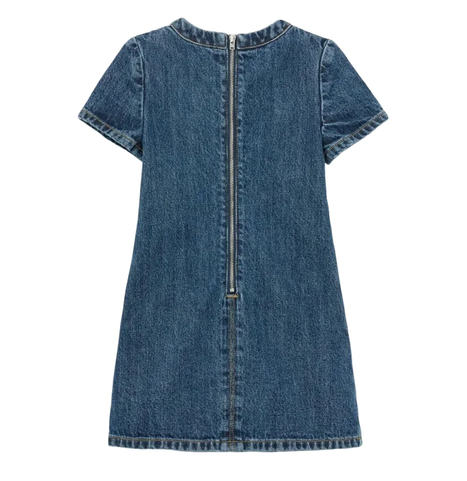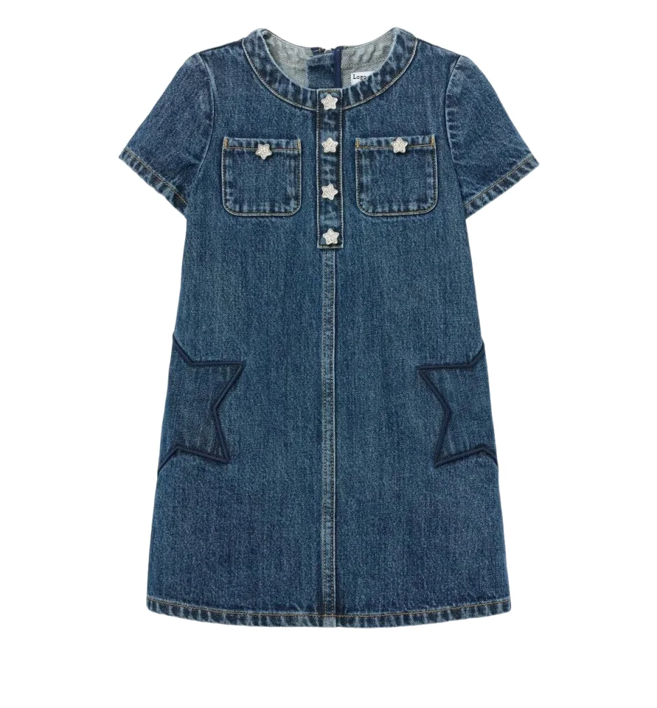 OEM & ODM Eco-Friendly Star Pattern Girls Summer Dress Heavyweight Washed Denim Pockets Knee Length New Design