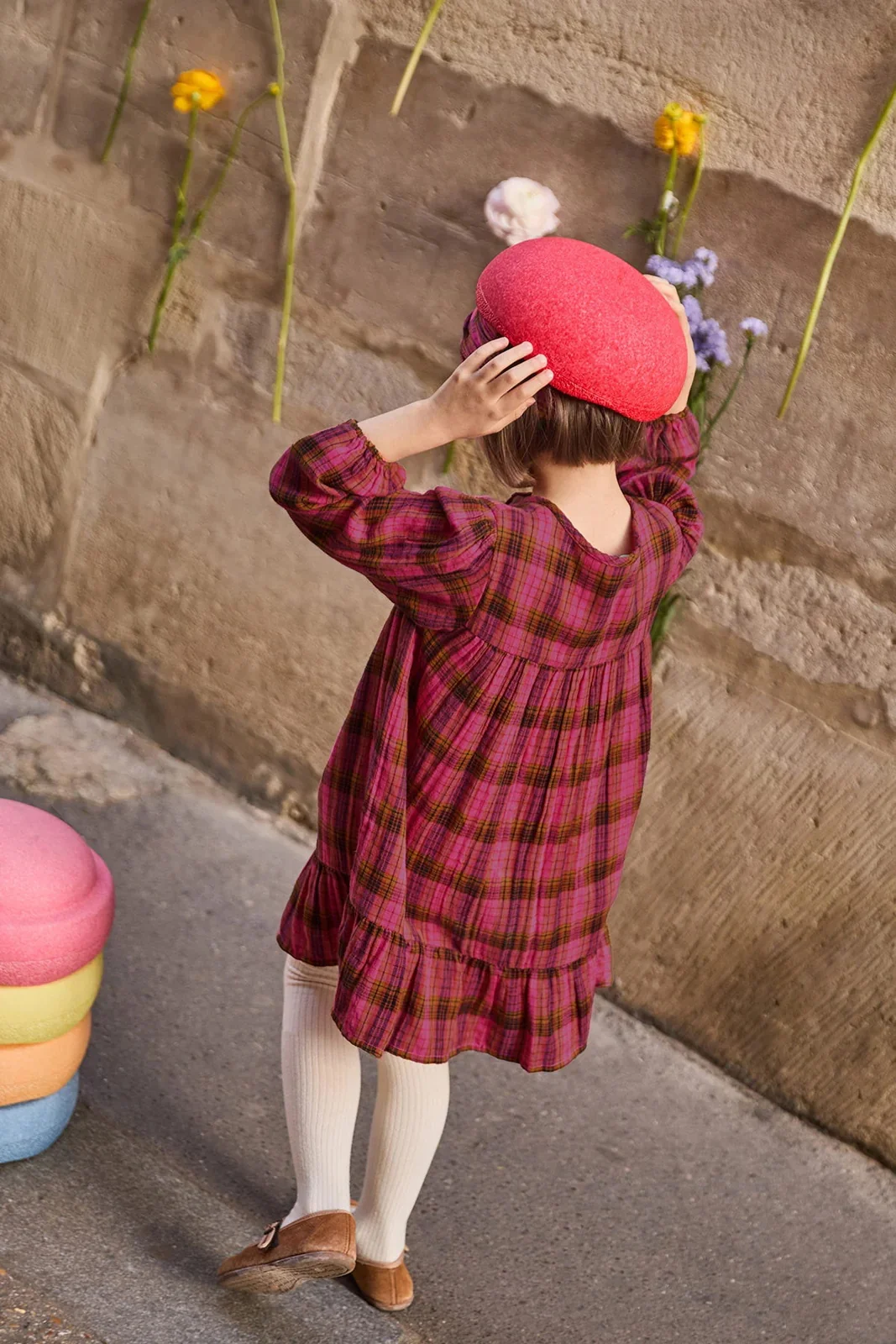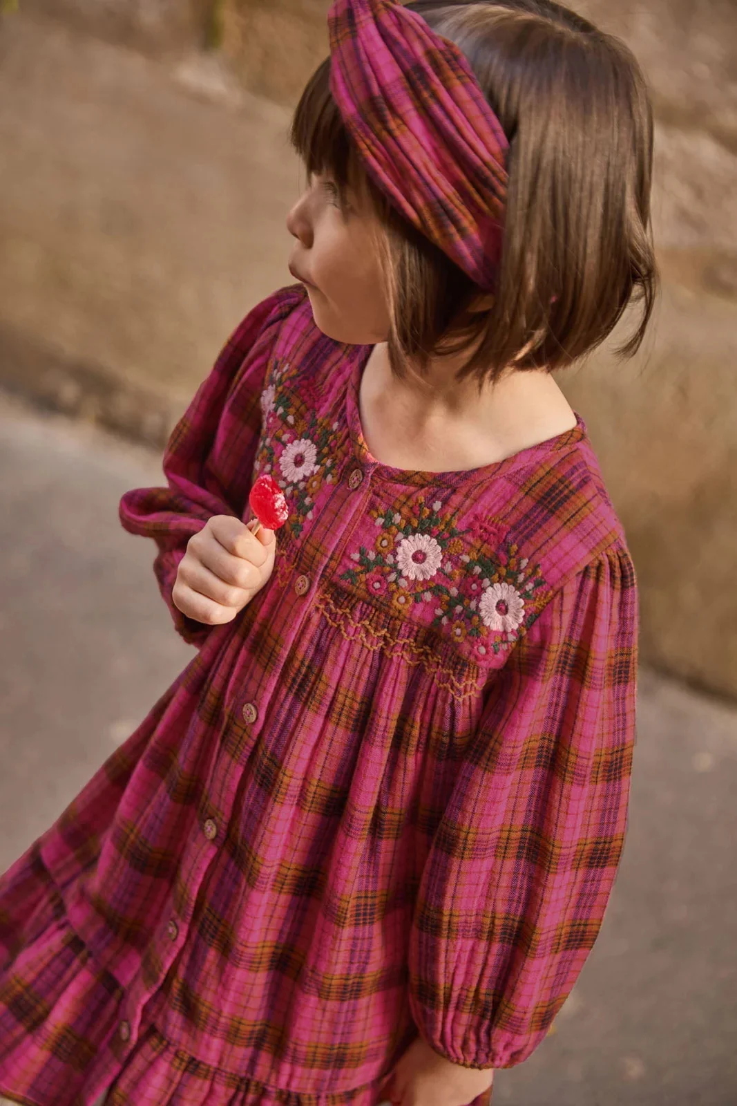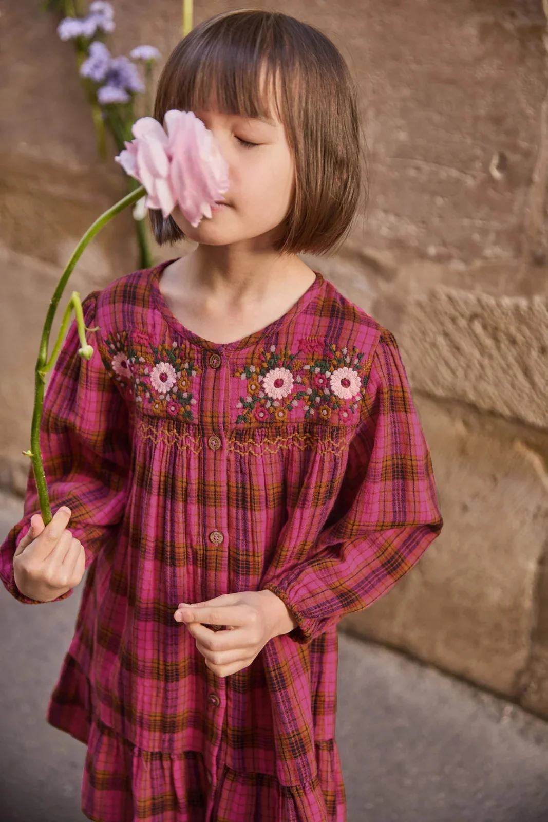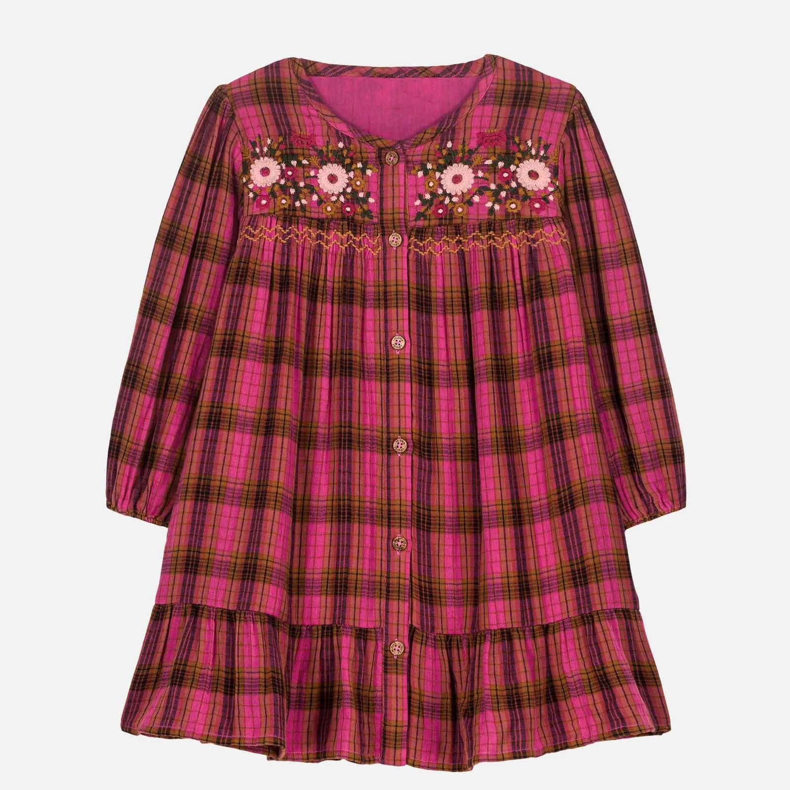Good Quality Elegant Stylish Vibrant Pink-and-brown Plaid Pattern Long Sleeves Floral Embroidery Retro Vibe Girls Dress Outfit