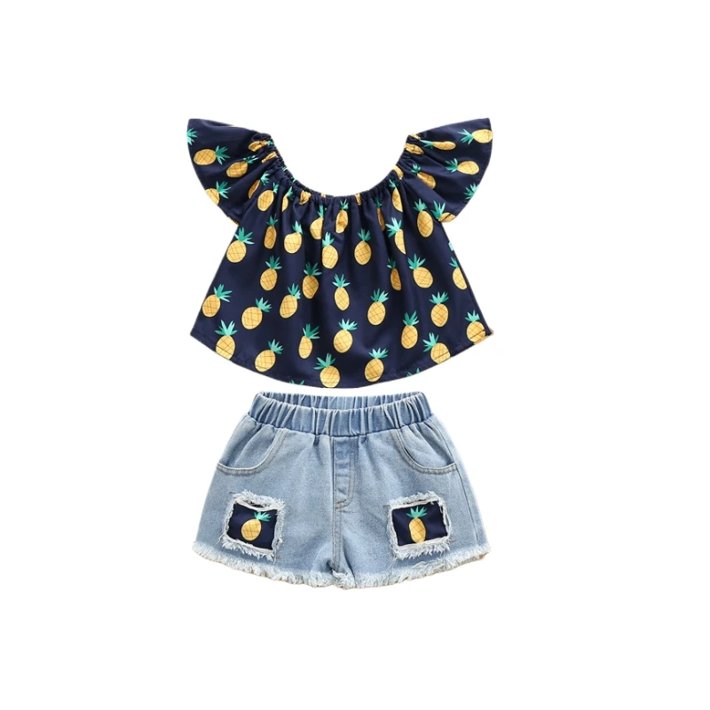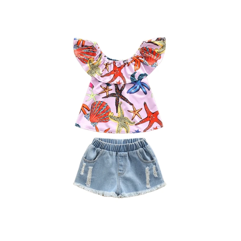 Toddler Kids Girls Summer Outfits Off Shoulder T-shirt Ripped Denim Shorts Sets