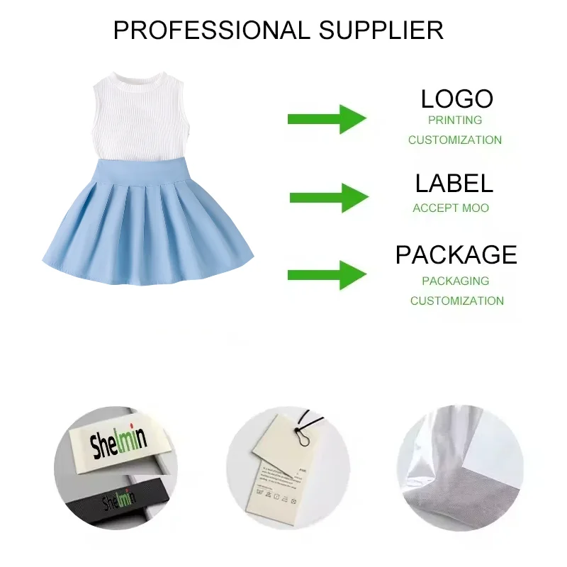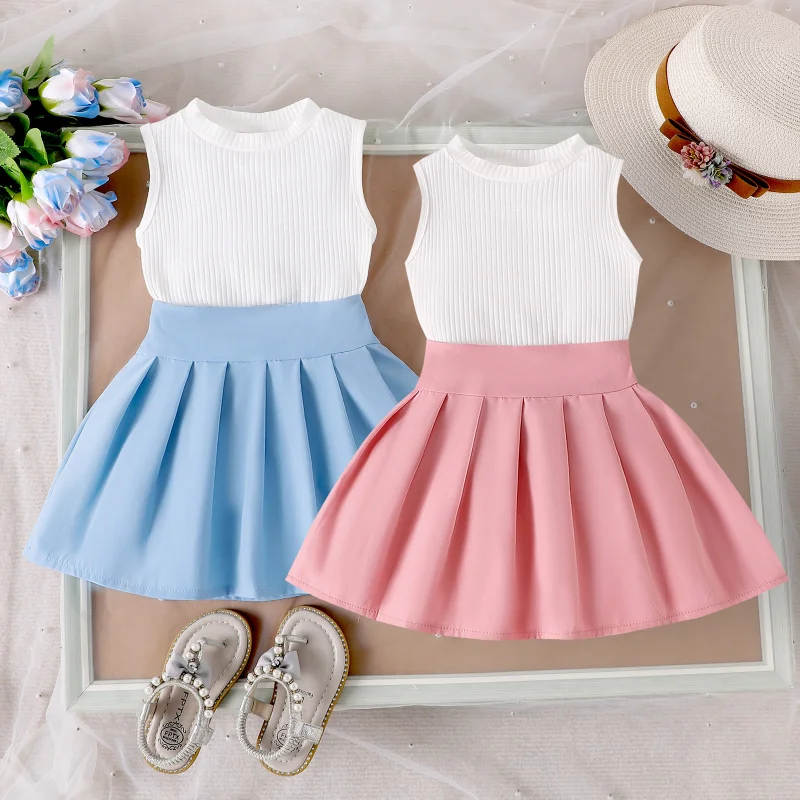 Wholesale Casual Girls Clothing Sets 2-Piece Kids Wear with Sleeveless Top and Pleated Mini Skirt Solid Pattern