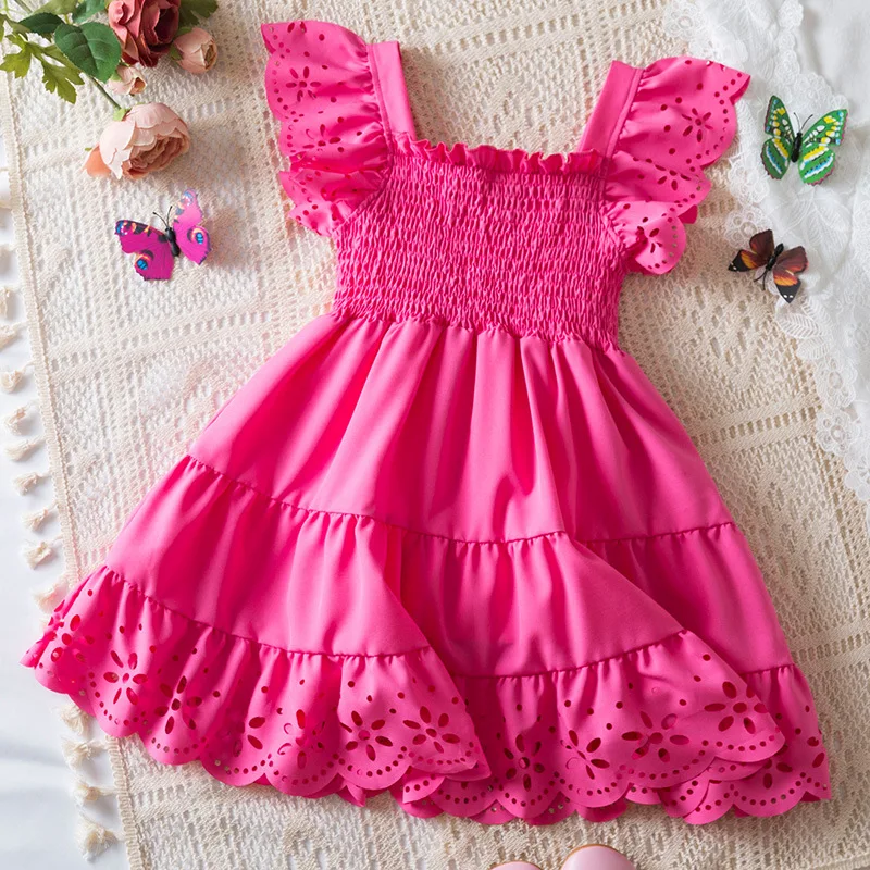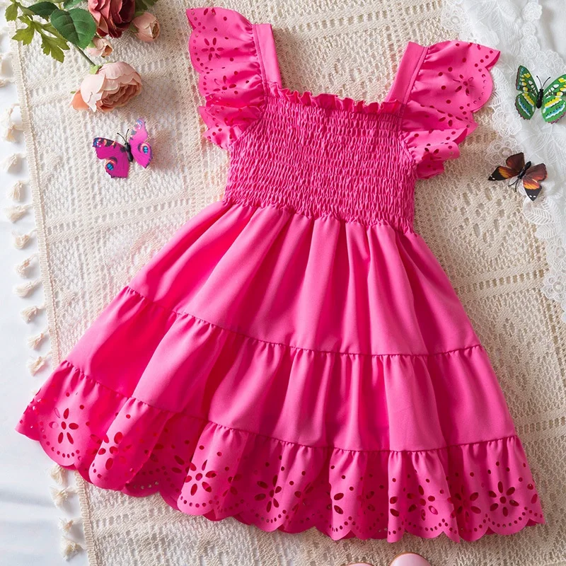 Summer New Solid Girls Dress Short Sleeve Lace Princess Flying Sleeve Ruffle Knee-Length Dresses for Girls