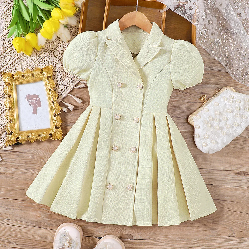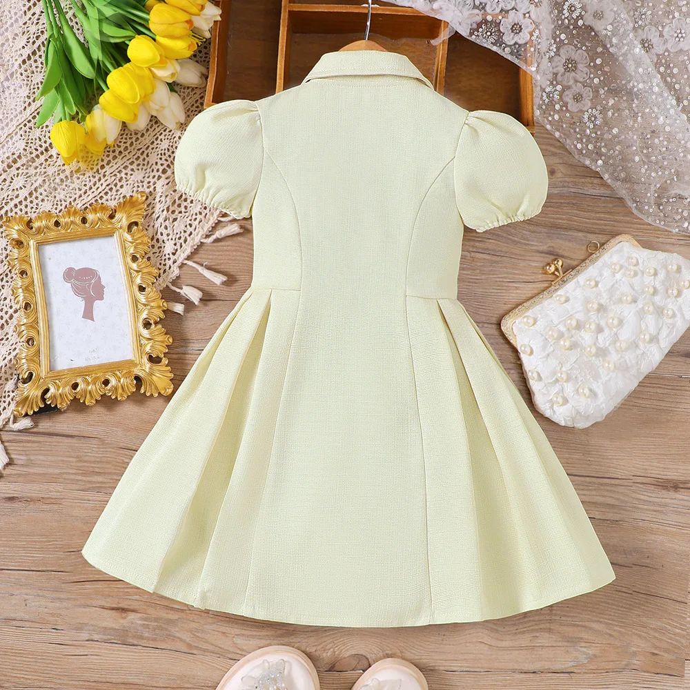 Summer Fashion Pure Color Dress Puff Sleeve Lapel Design Girls Dresses for Girls