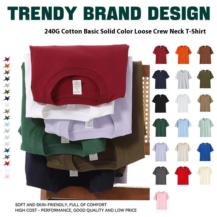Trendy Loose Simple Versatile 240G Compact Cotton Short Tee Solid Basic Neck Men's T-Shirt